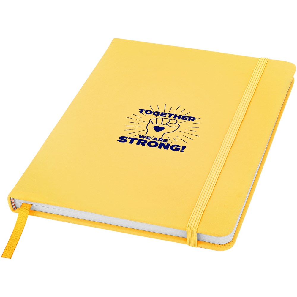 A5 Notizbuch mit farblich passendem elastischen Verschluss und Leseband. Inkl. 96 Blatt (60 g/m²), liniert.