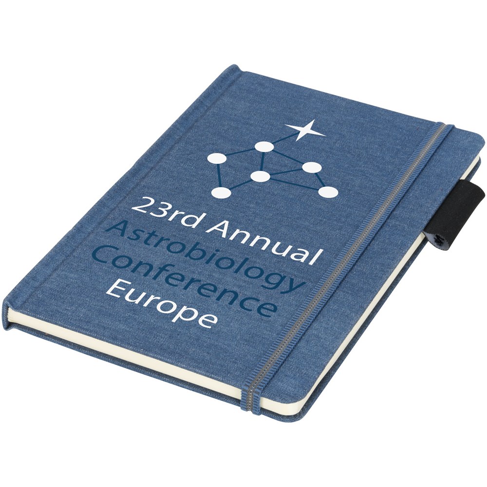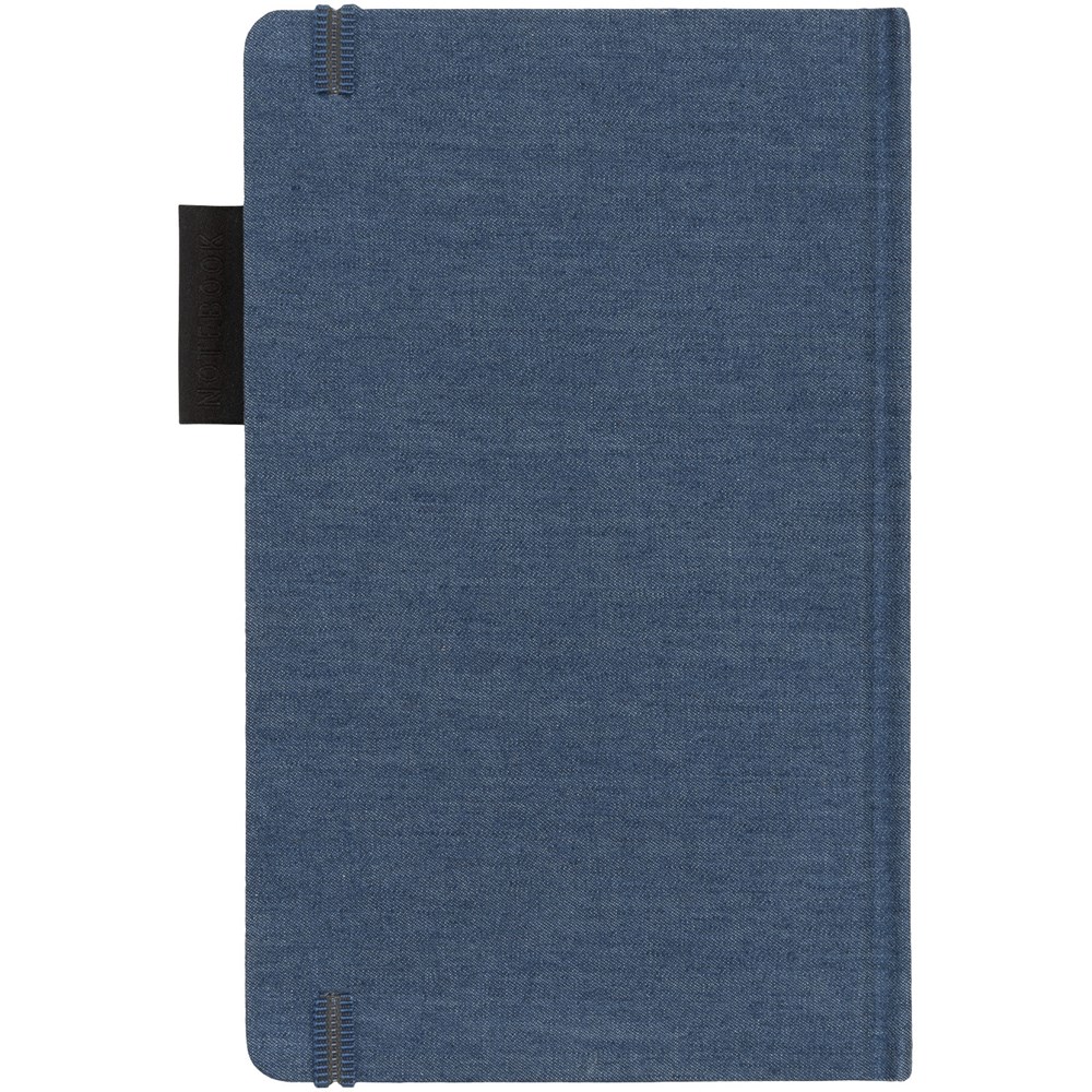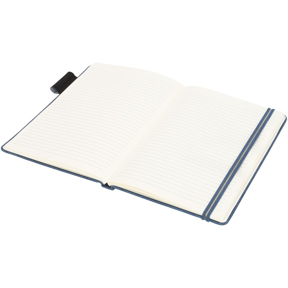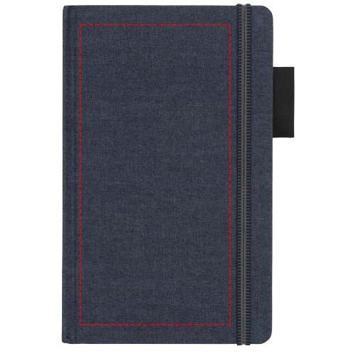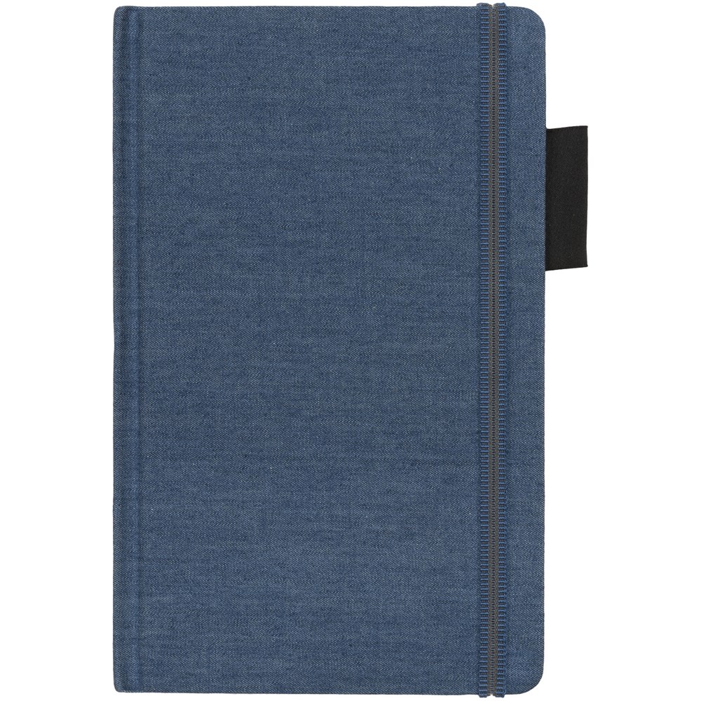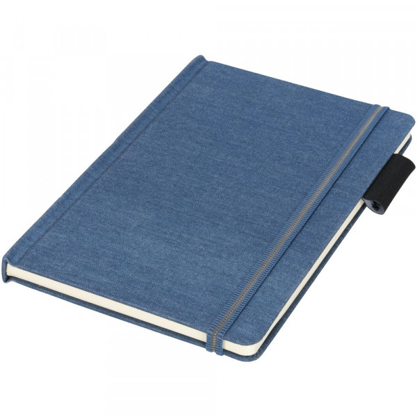 Ein A5-Notizbuch aus Jeansstoff mit 80 Blatt (80 g/m³) liniertem cremefarbigem Papier, Gummibandverschluss im besonderen Design, Bandlesezeichen und Stiftschlaufe. Verpackt in einem Geschenkkarton.