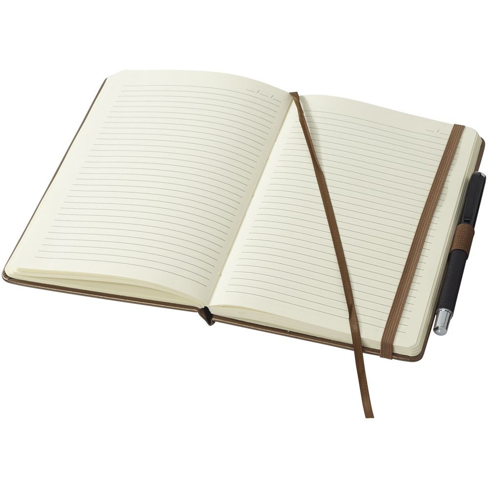 A5 Notizbuch mit Hard Cover, farblich passendem, elastischen Verschluss, Stiftschlaufe und Leseband. 96 Blatt, 80 g/m², cremefarben, liniert, mit Datumsymbol gedruckt auf jeder Seite. Mit erweiterbarer Tasche auf der Rückseite für kleine Notizen. Verpackt in schwarzer Geschenkbox.