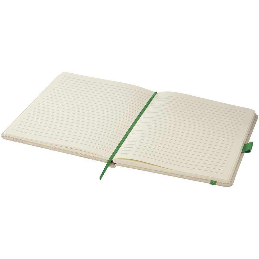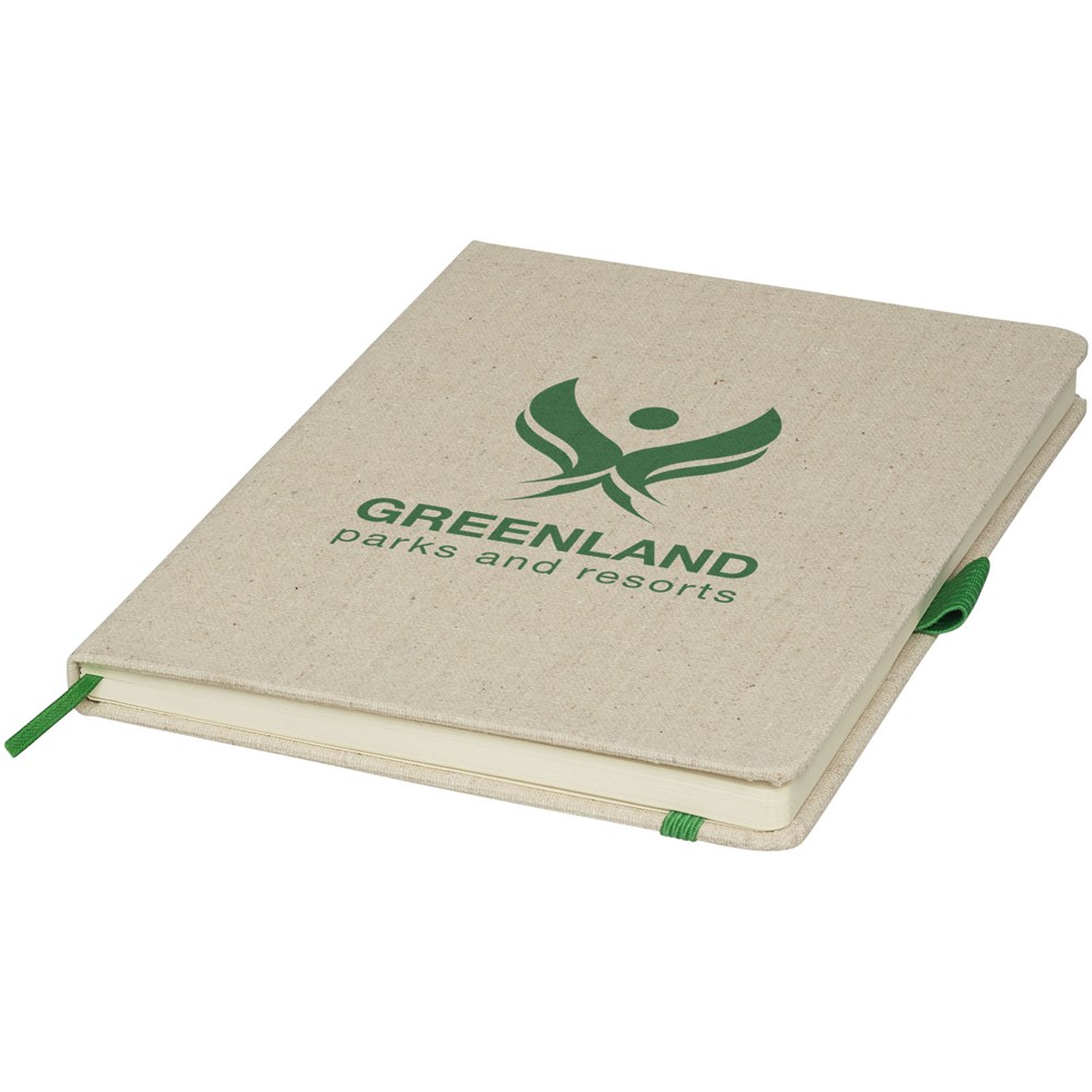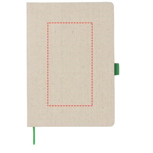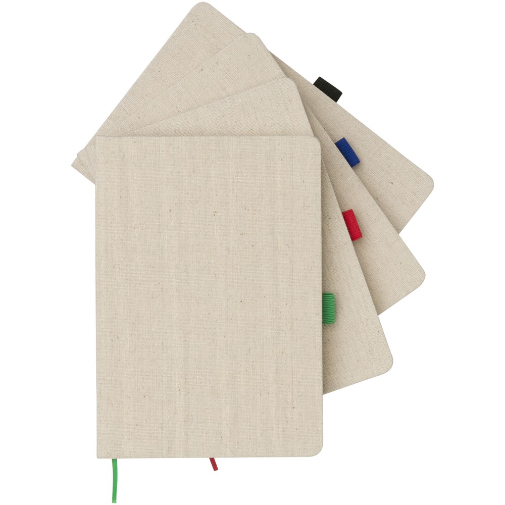 A5 Canvas Notizbuch mit farbigem, elastischen Verschluss und Leseband. Inkl. elastischer Stiftschlaufe und 80 Blatt (70 g/m²) liniert.