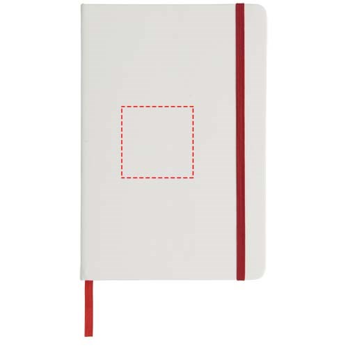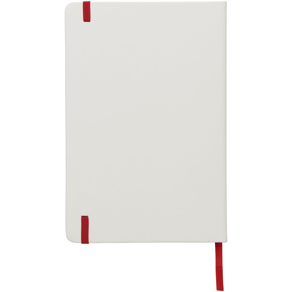 Weißes A5 Notizbuch mit farbigem Gummizug und Lesebändchen. Enthält 80 Blatt (60 g/m²) liniertes Papier.