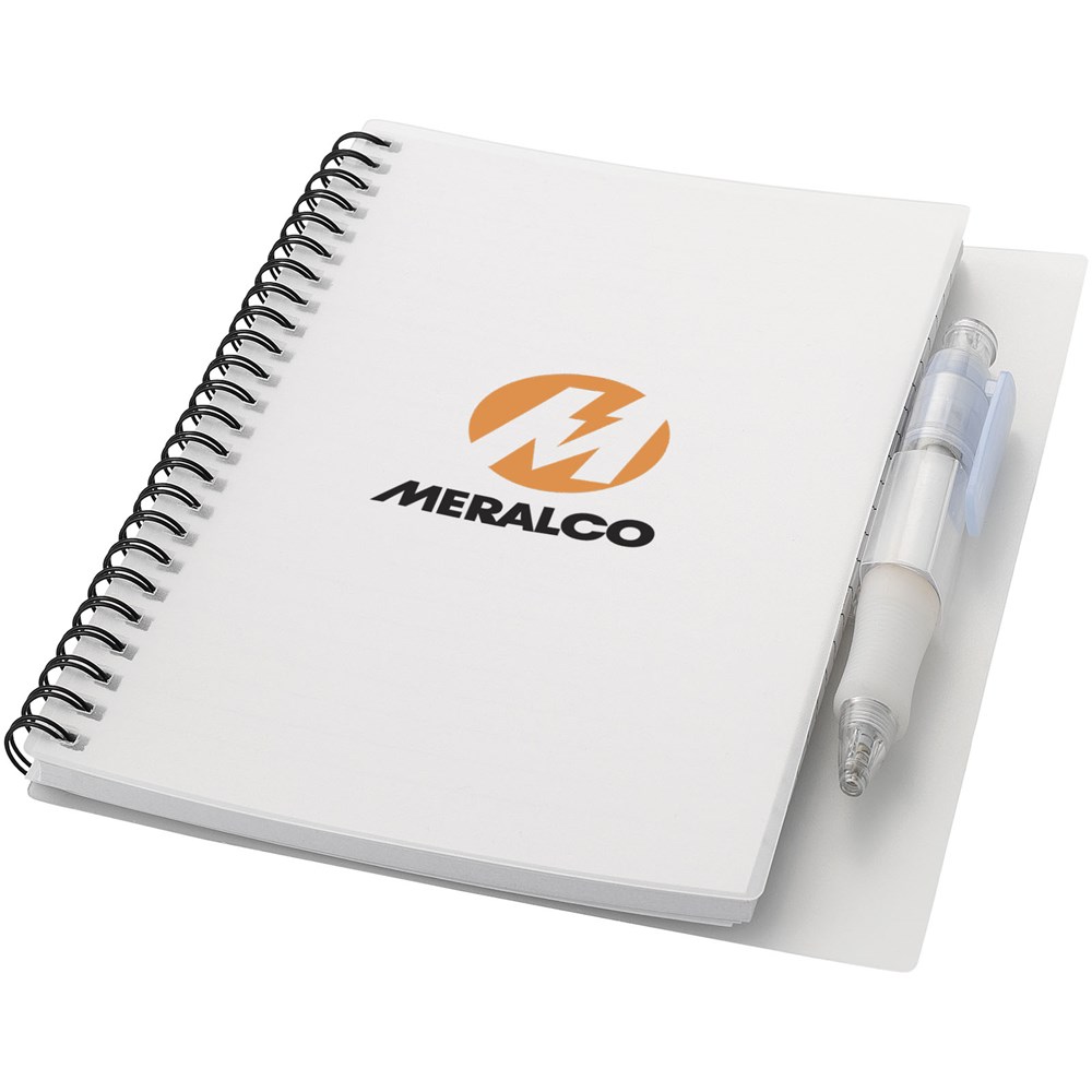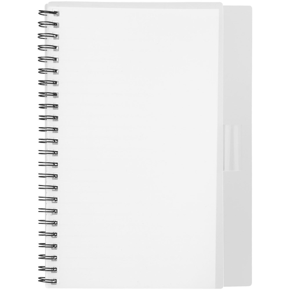 Spiral Notizbuch mit 80 Blatt liniertem A5 Papier. Mit farblich passendem Kugelschreiber mit Softtouch Griff.