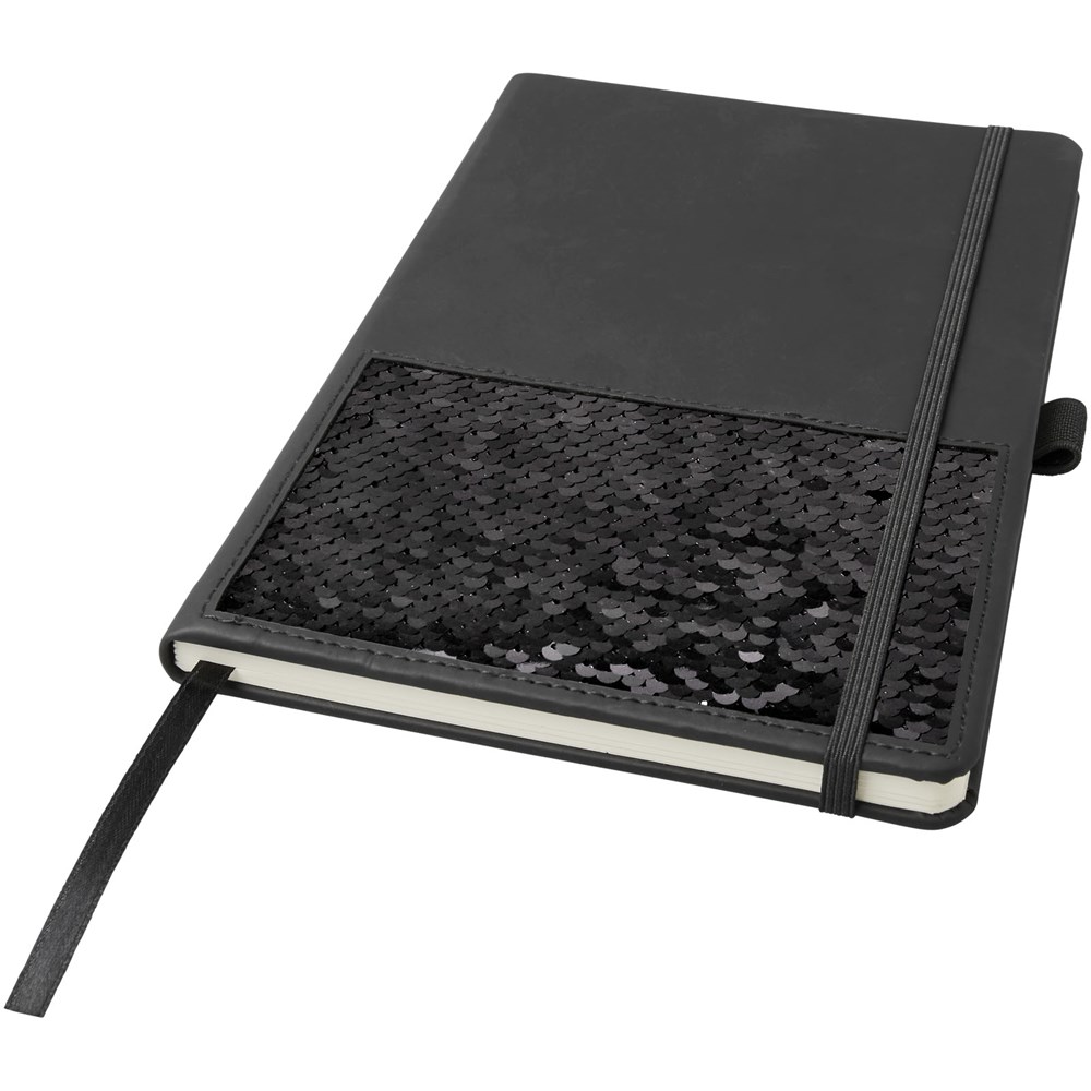 Notizbuch mit wendbaren Pailletten in Schwarz und Silber, geliefert in einer schwarzen Luxe-Hülle. Spezifikationen: Hülle (Thermo-PU): 15,6 x 21,2 cm, 70 g/m2 Papier, 80 Blatt cremefarbenes Papier, liniertes Format, elastischer Verschluss, Farbbandmarker und eine Stiftschlaufe.