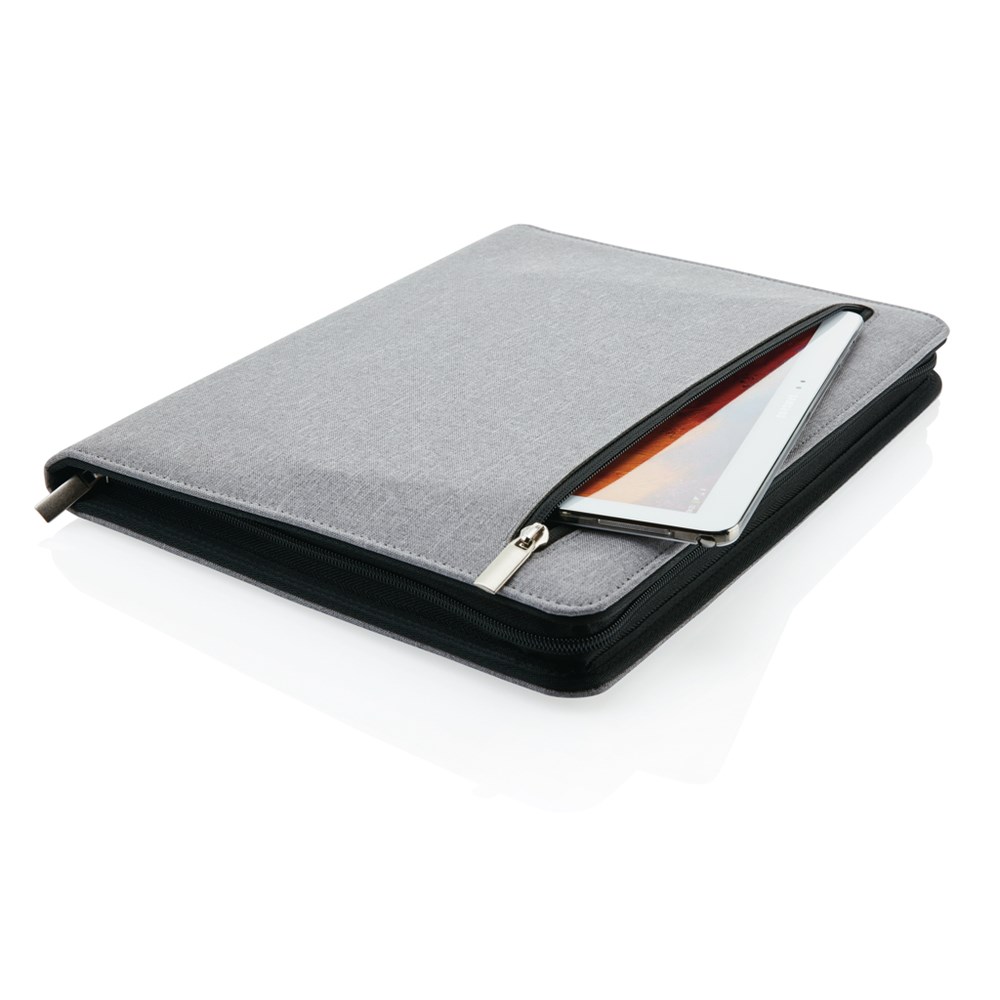A4 Portfolio aus Leinen mit Tablet/Smartphone Halter und Smartphonefach mit Sichtfenster, durch das auch eine Bedienung des Smartphones möglich ist (passend für iPhone6 & Samsung S6 etc.). Weitere Halter für Ihre Ladekabel und Ihre Powerbank sowie 5 Kartenfächer und einem Außentasche mit Reißverschluss für Ihre Dokumente oder Ihr Tablet. Mit einem 20-seitigen A4 Block.