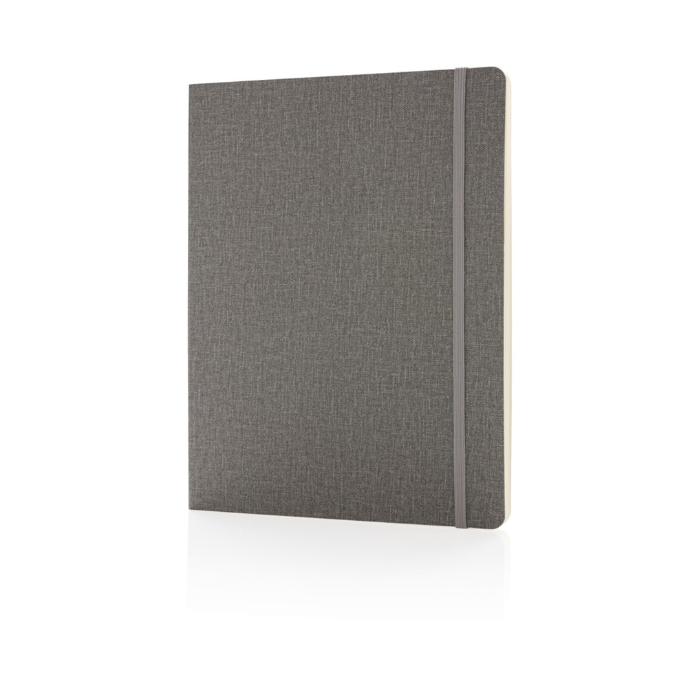 Flexibles Softcover Notizbuch im B5 Format, 19x25cm. Mit elastischem Verschlußband, Seitentrenner und rückseitiger Tasche. 160 cremefarbene, linierte Seiten, 78g/qm