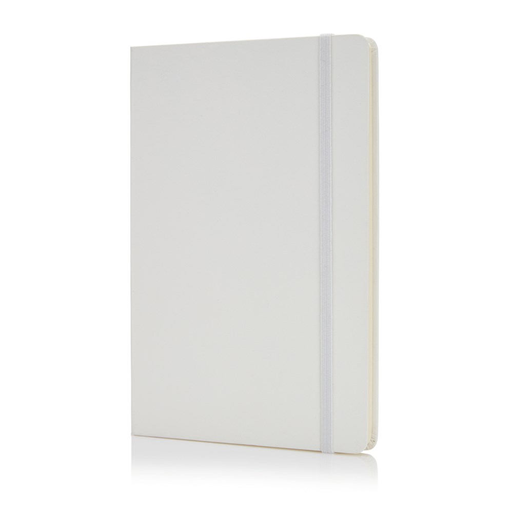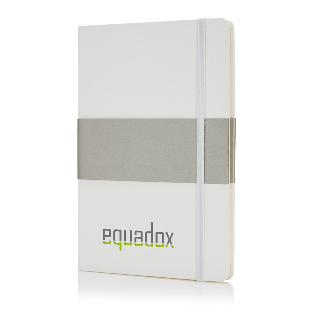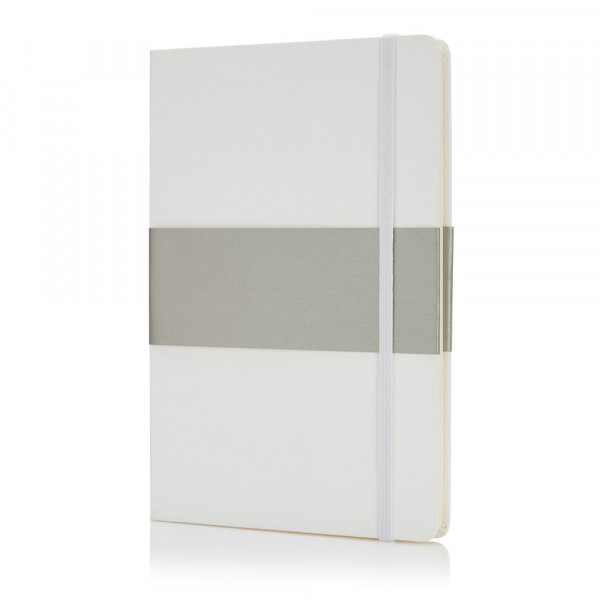 Größe A5, mit silbernem Papiersleeve, schwarzem Seitenteiler und Gummiband, runde Ecken, innen 160 cremefarbene linierte Seiten, 80g/m² Papier.