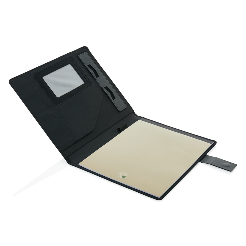 A4 Tech Portfolio mit luxuriösem, magnetischem Metallverchluss. Im Inneren befindet sich ein Tablet-/Handyhalter mit transparentem Fenster, über dieses Sie Ihr mobiles Gerät im Auge behalten und bedienen können. Passend für alle herkömmlichen Handys, u.a. iPhone 6 & Samsung S6. Inkl. Dokumentenhülle, 2 Kartenhaltern, Stifteschlaufe und 1 A4 Notizblock mit 20 Blättern.