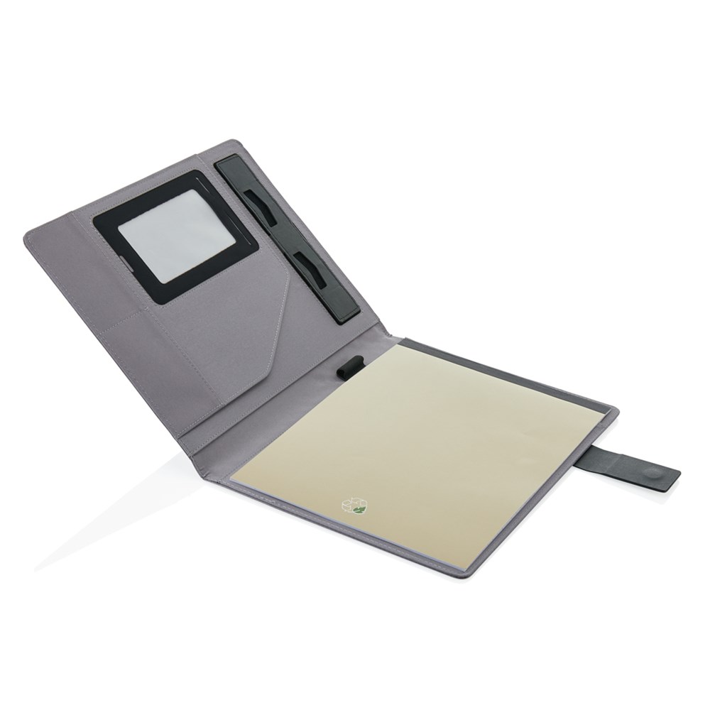 A4 Tech Portfolio mit luxuriösem, magnetischem Metallverchluss. Im Inneren befindet sich ein Tablet-/Handyhalter mit transparentem Fenster, über dieses Sie Ihr mobiles Gerät im Auge behalten und bedienen können. Passend für alle herkömmlichen Handys, u.a. iPhone 6 & Samsung S6. Inkl. Dokumentenhülle, 2 Kartenhaltern, Stifteschlaufe und 1 A4 Notizblock mit 20 Blättern.