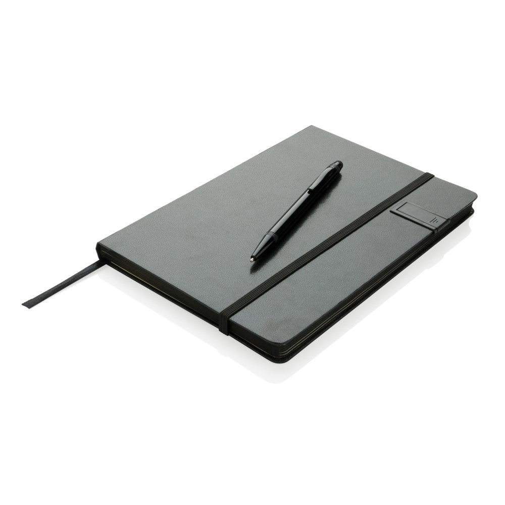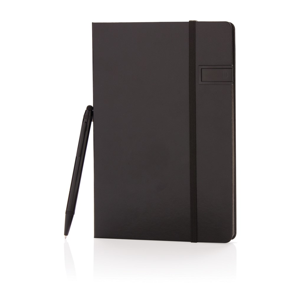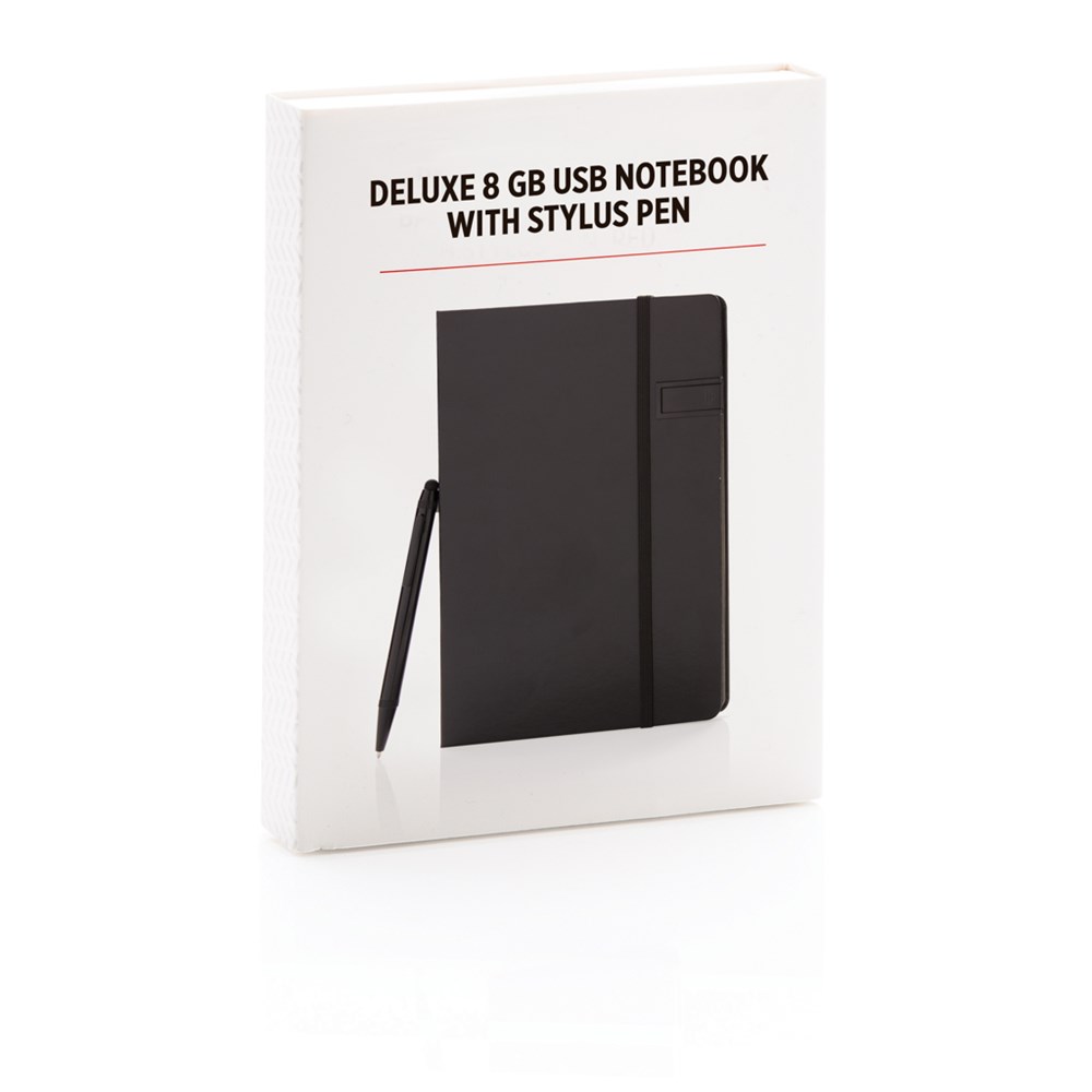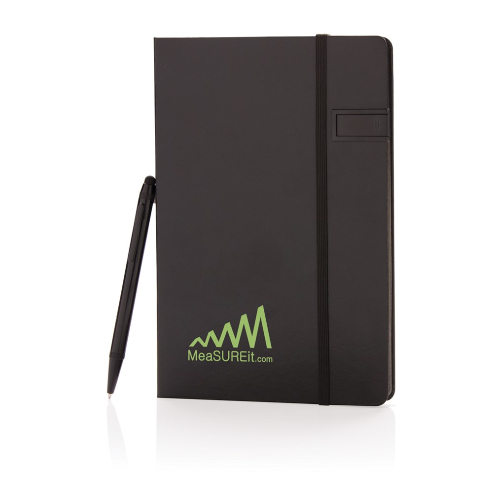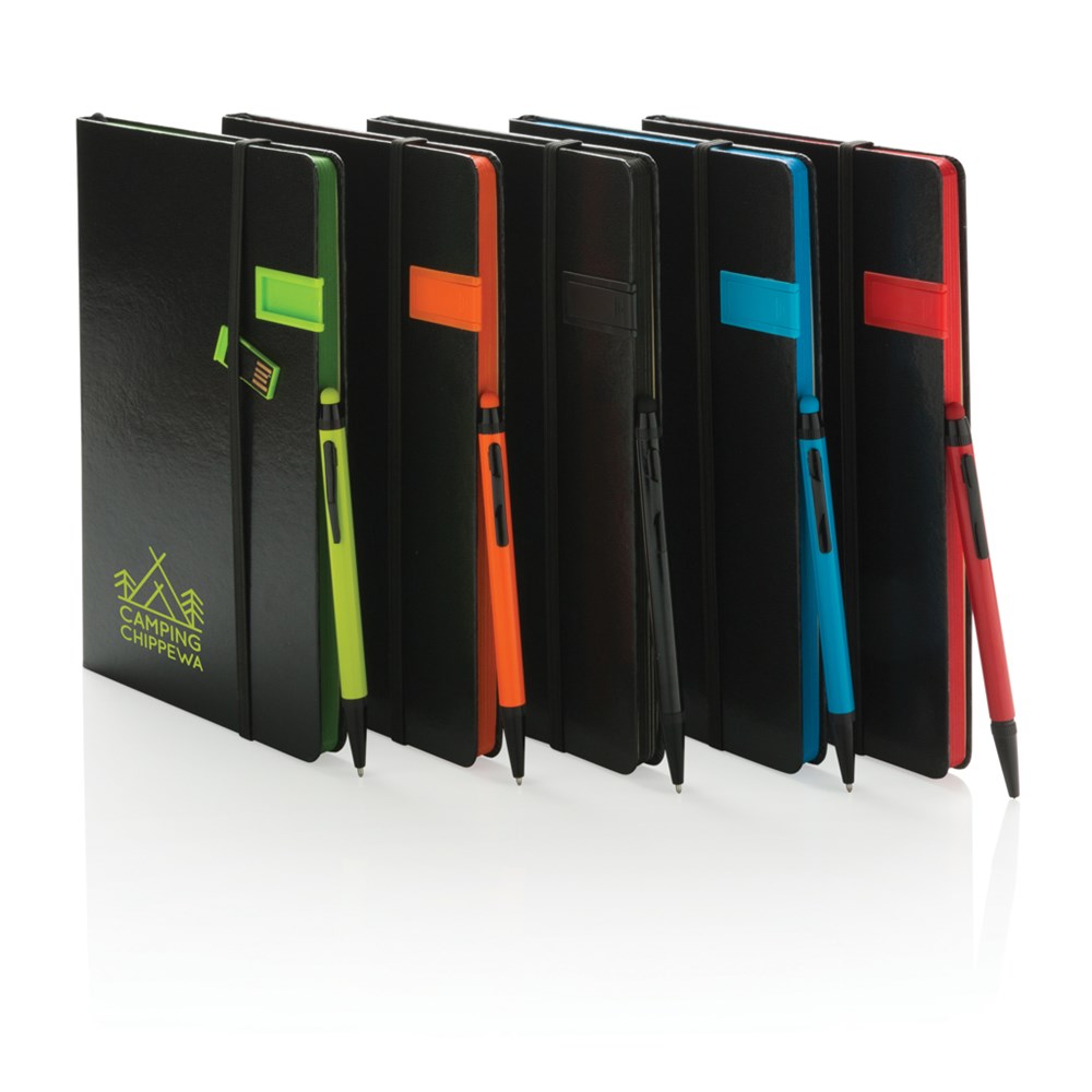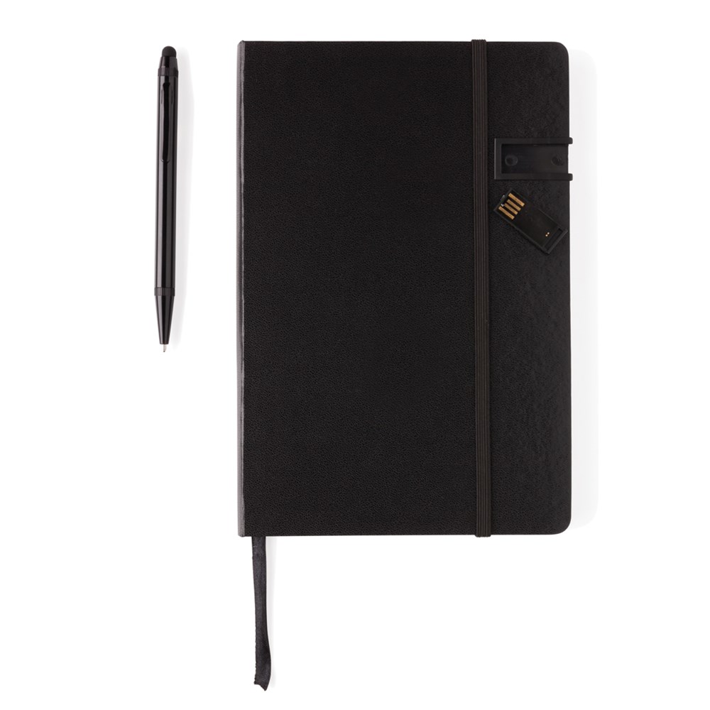 Hardcover Notizbuch mit 8GB USB-Stick. 160 linierte Seiten, 80g/m² - farbiger Beschnitt. Im Set mit einem farblich passenden Aluminium Stylus-Stift. Verpackt in Geschenkbox