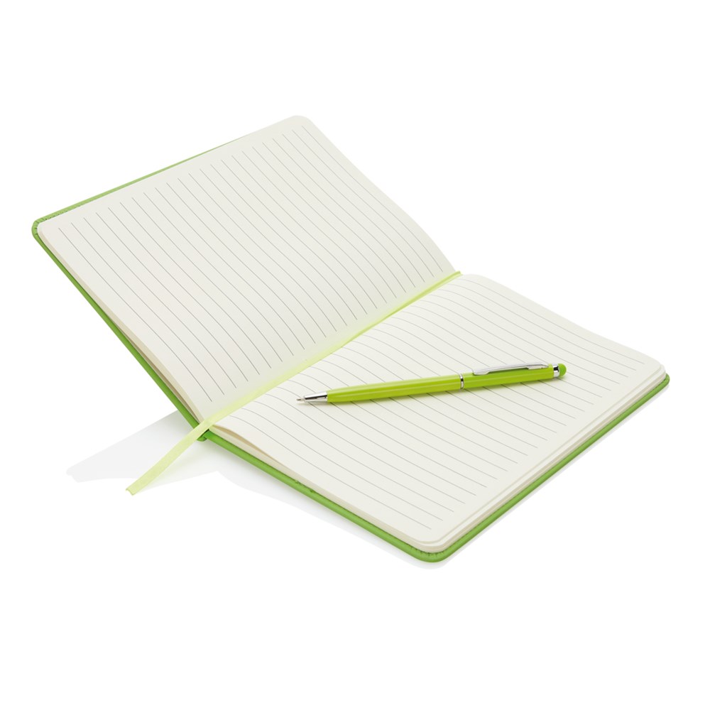 Die perfekte Kombination: A5 PU Notizbuch mit Stifteschlaufe und Stylus Stift aus Metall. 160 linierte Seiten von 80g/m² Papier im Inneren. Konfektioniert in Geschenkbox.