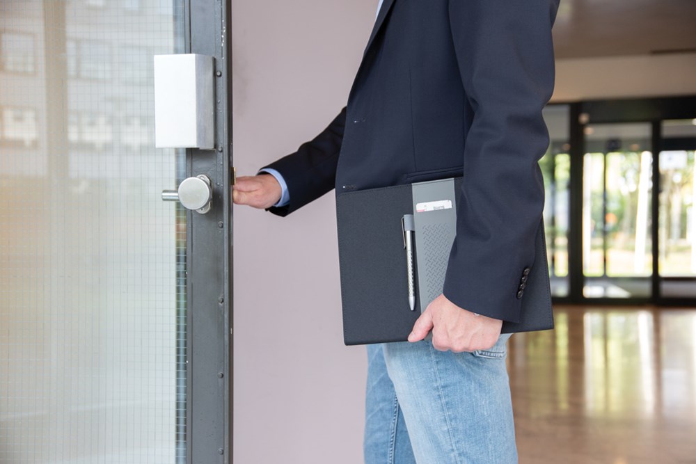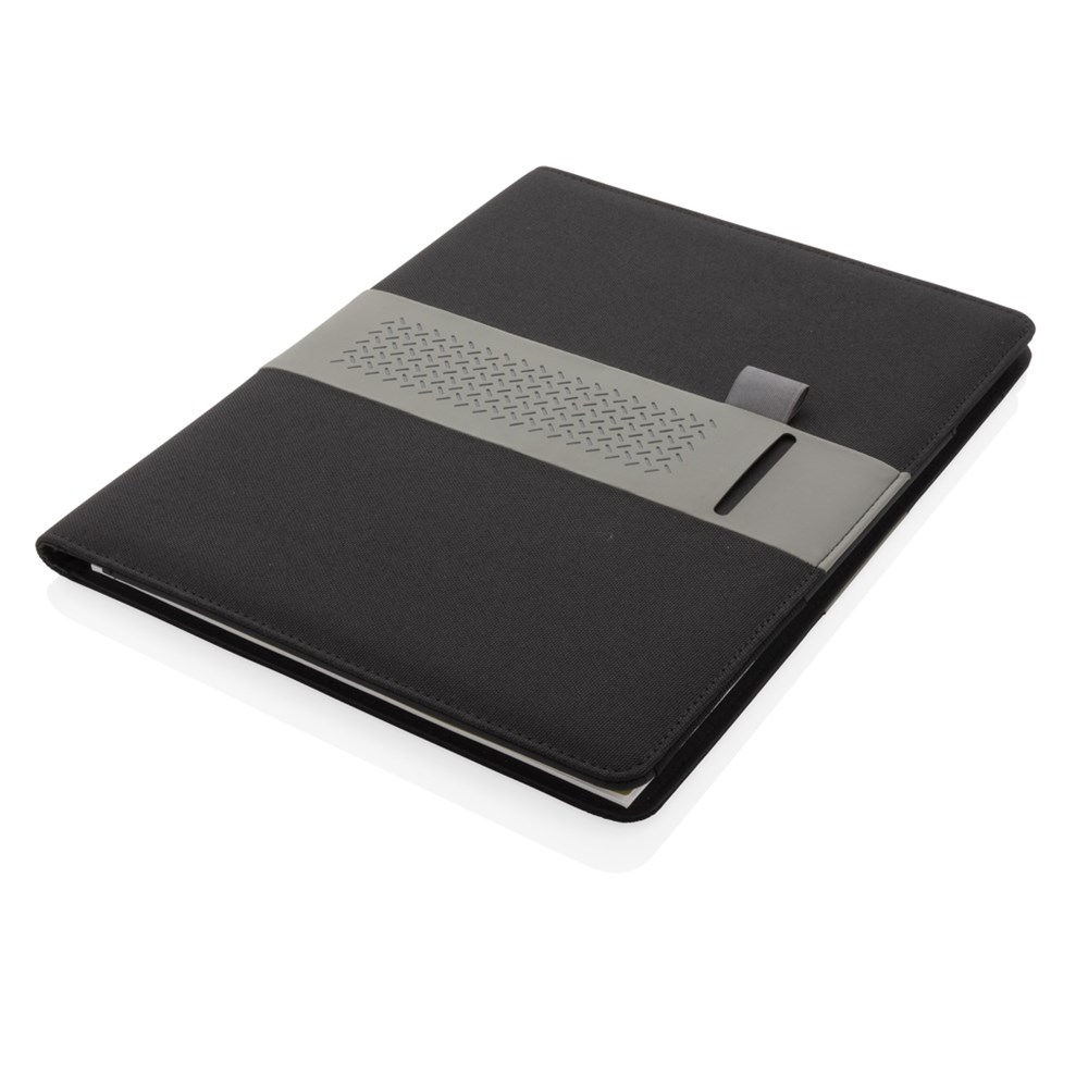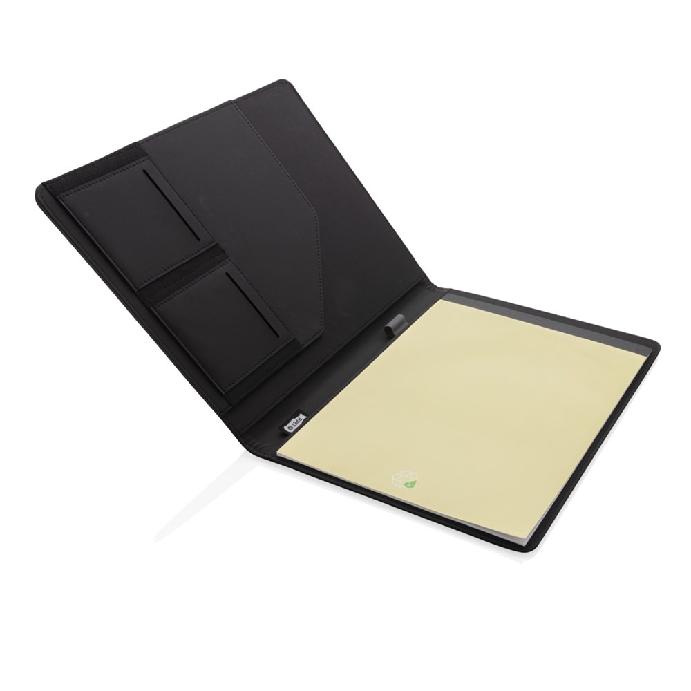 Dieses Portfolio bietet neben dem Notizblock mit 20 A4 Blättern, 70gr/m² weißes recyceltes Papier, auch noch Fächer für Visitenkarten oder Notizen sowie 2 Stiftschlaufen.