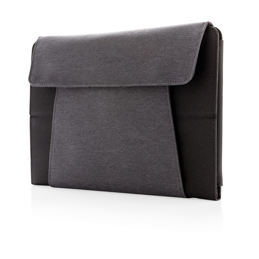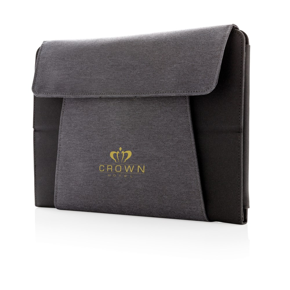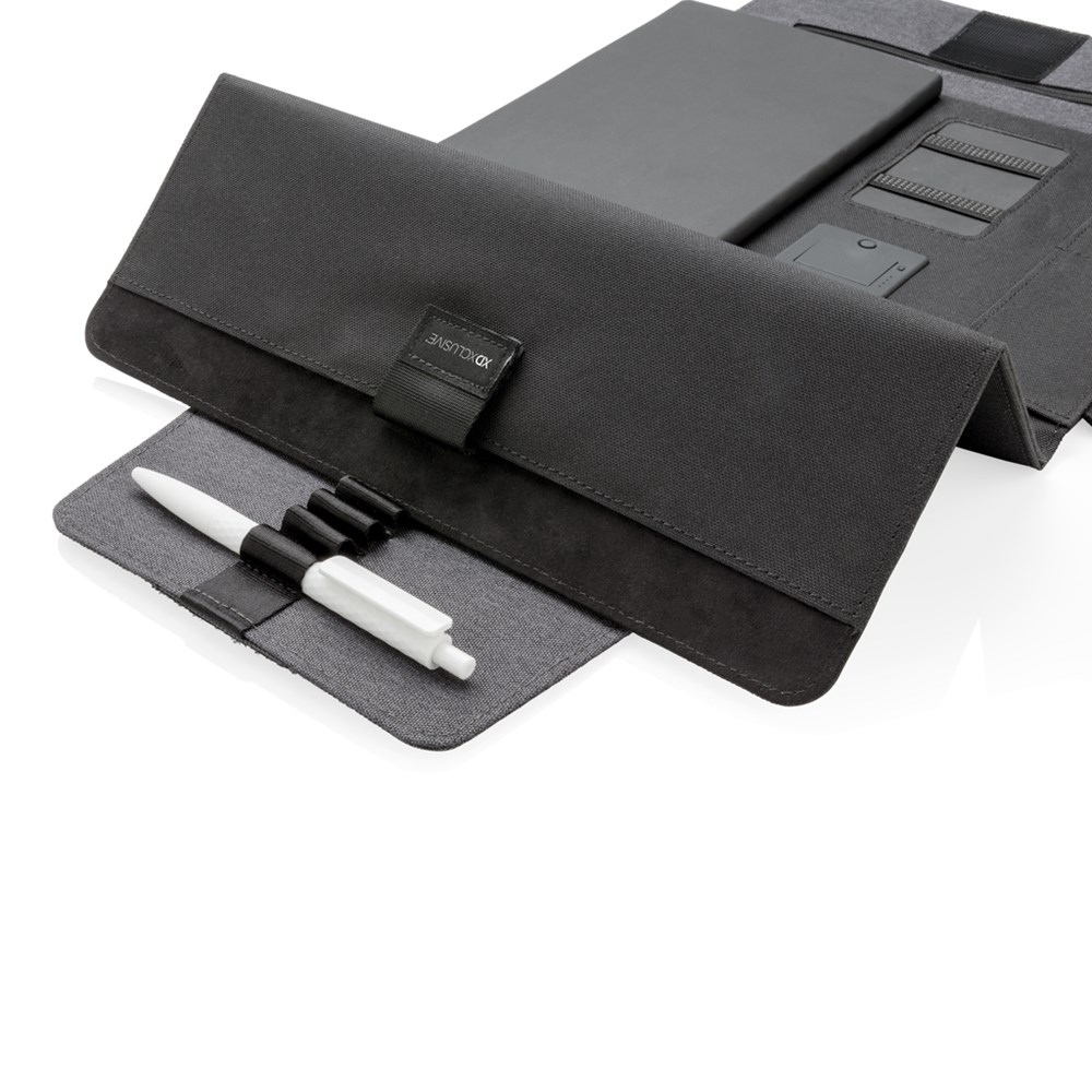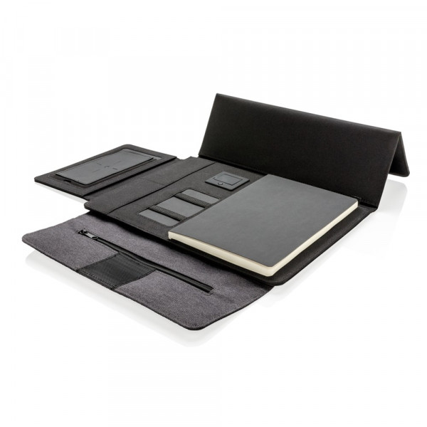Öffnen Sie das Kyoto Tabletportfolio und überzeugen Sie sich selbst; dieses Portfolio kann alle benötigten Büroartikel sowie Ihr Tablet unterbringen. Inklusive einer 4.000 mAh Wireless-Charging Powerbank. Kompatibel mit allen QI-fähigen Smartphones wie z.B. Androids neuster Generation, iPhone 8 und höher. Input 5.0V/1.0A. Output: 5.0V/2.1A. Wireless Output: 5W. Hergestellt aus Polyester. Inklusive herausnehmbarem Notizbuch mit 64 creme-farbene Blättern / 128 linierten Seiten. 80g/m2. Registered design®