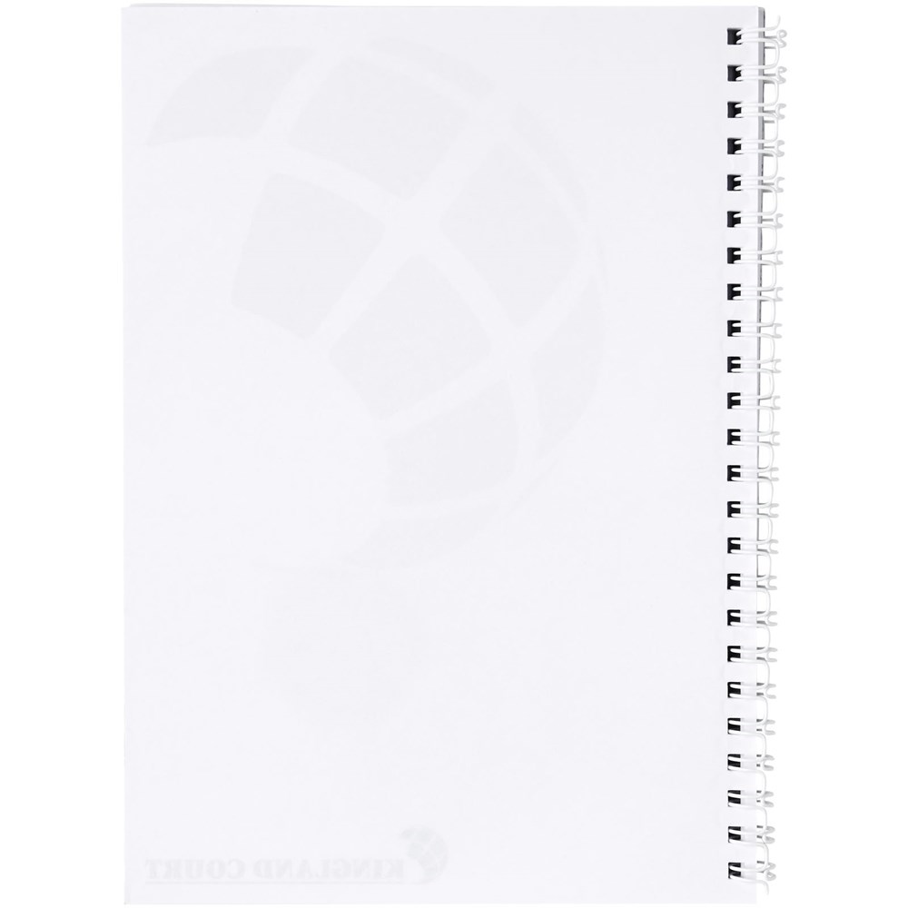 Desk-Mate® A5 Spiralnotizbuch.Standardlieferung mit 50 Blatt 80g/m2-Papier, einem glänzenden Karton-Deckblatt (250g/m2) und einem transparenten Polypropylenumschlag von 450 Mikron. Schwarze oder weiße Spiralbindung. Auch erhältlich mit 100 Blatt. Vollfarbdruck auf dem Deckblatt und jedem Einzelblatt möglich.