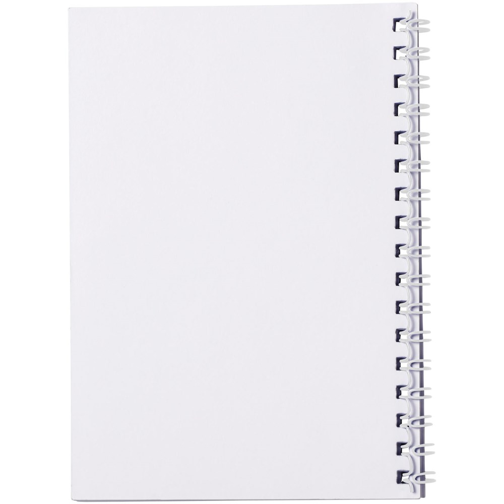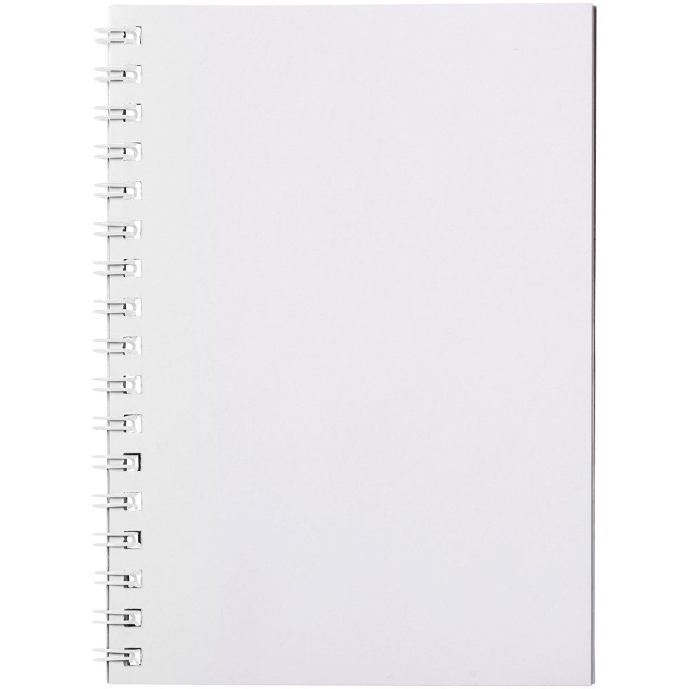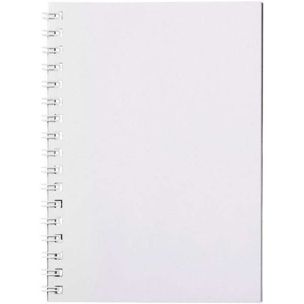 Desk-Mate® A6 Spiralnotizbuch. Enthält 50 Blatt 80g/m2-Blankopapier, ein glänzendes Karton-Deckblatt (250g/m2) und einen transparenten Polypropylenumschlag von 450 Mikron. Schwarze oder weiße Spiralbindung. Auch erhältlich mit 100 Blatt. Vollfarbdruck auf dem Deckblatt und jedem Einzelblatt möglich.