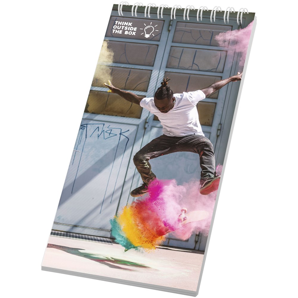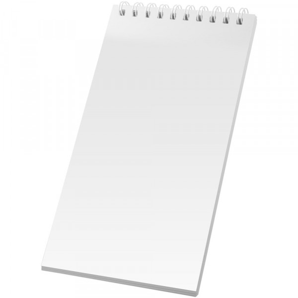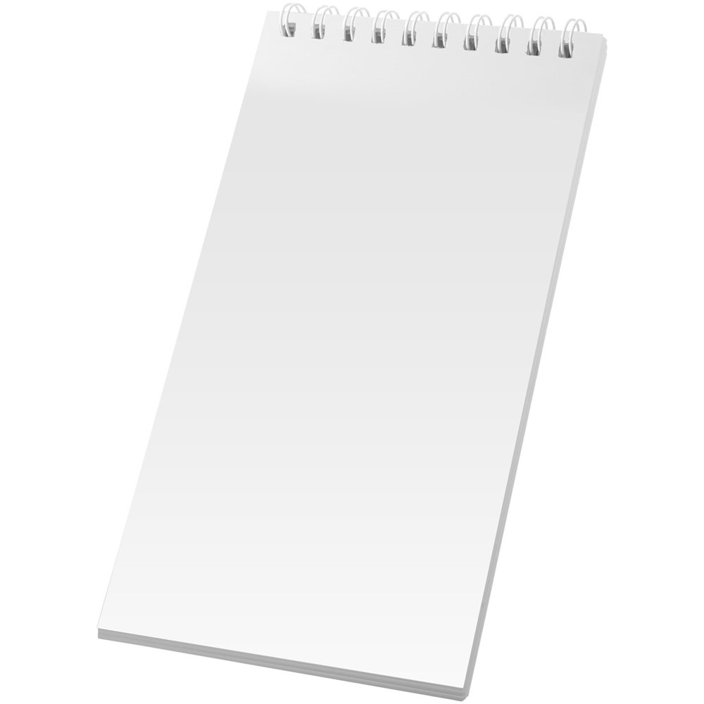 Desk-Mate® A4 Spiralnotizbuch. Dieses Notizbuch verfügt über eine weiße oder schwarze Spiralbindung, ein glänzendes Karton-Deckblatt (250g/m2) und 50 Blatt 80g/m2-Blankopapier. Eine Dekoration ist auf dem Umschlag sowie jedem Blatt möglich.