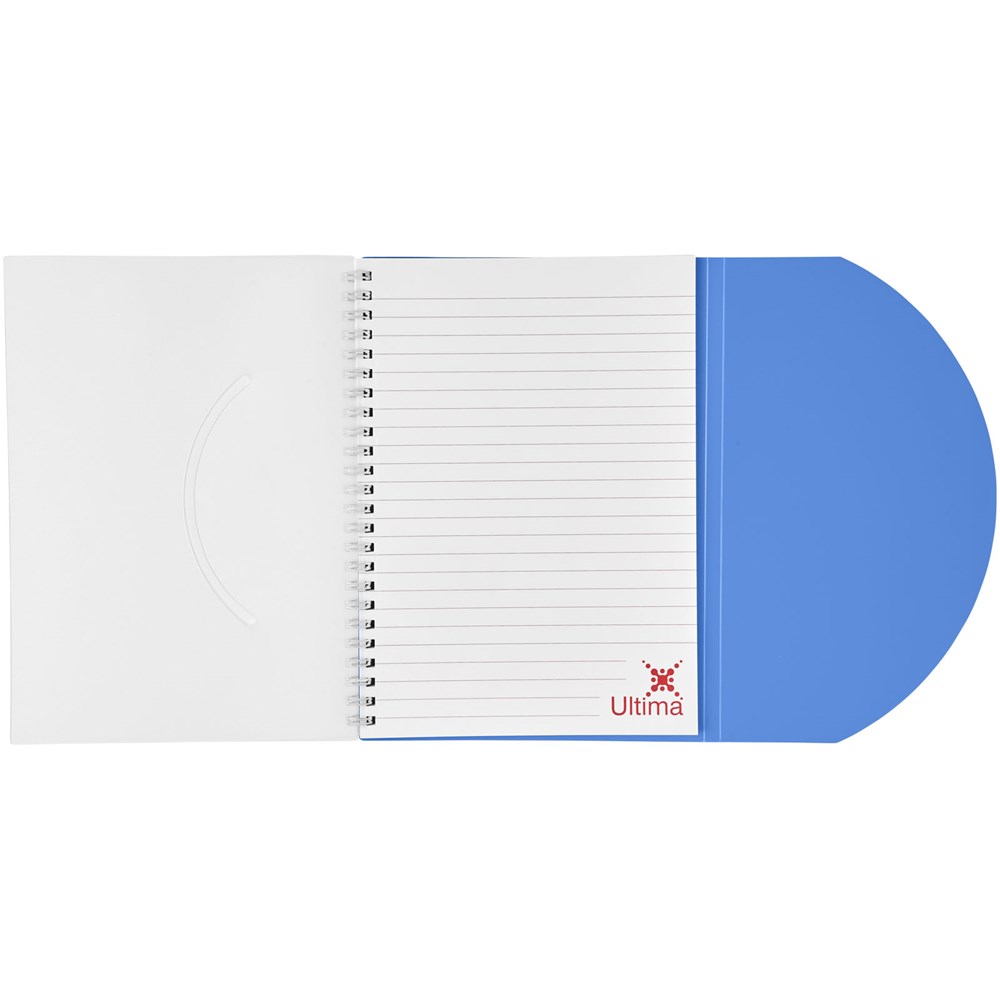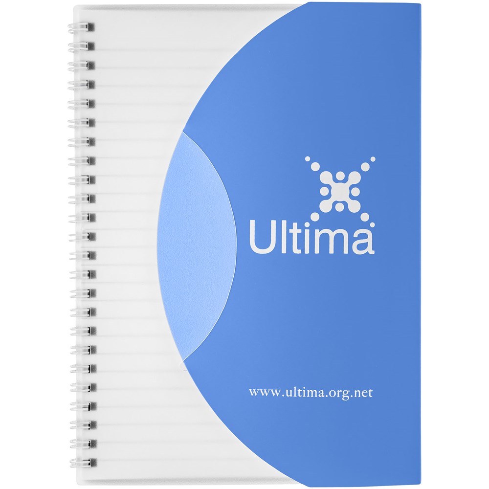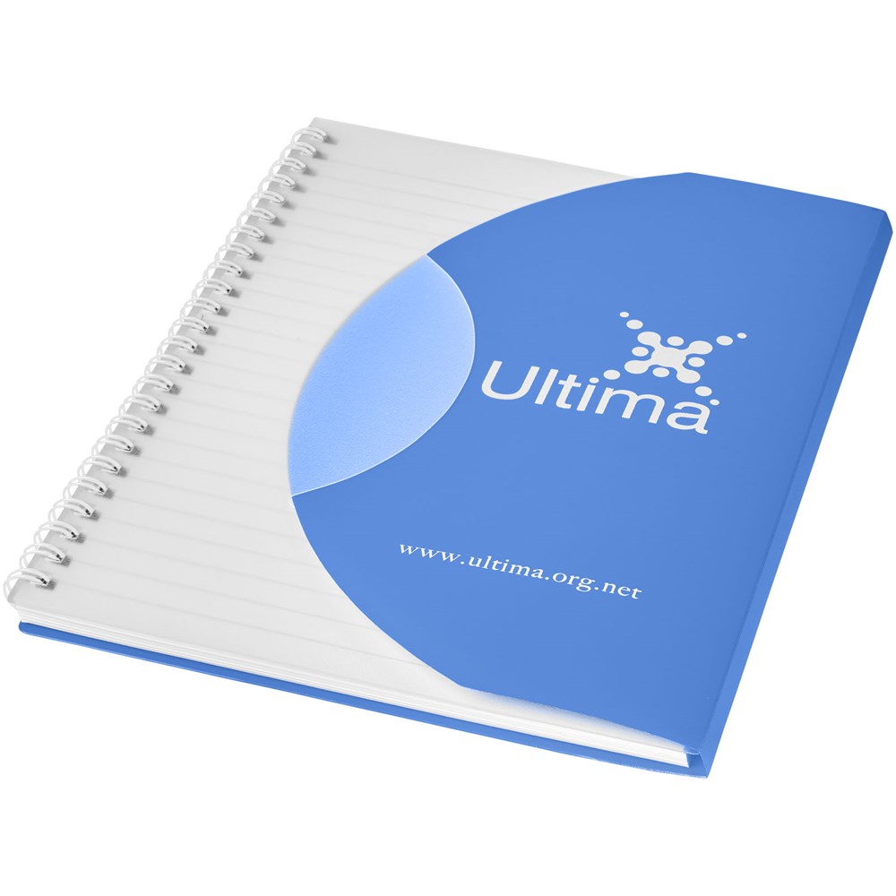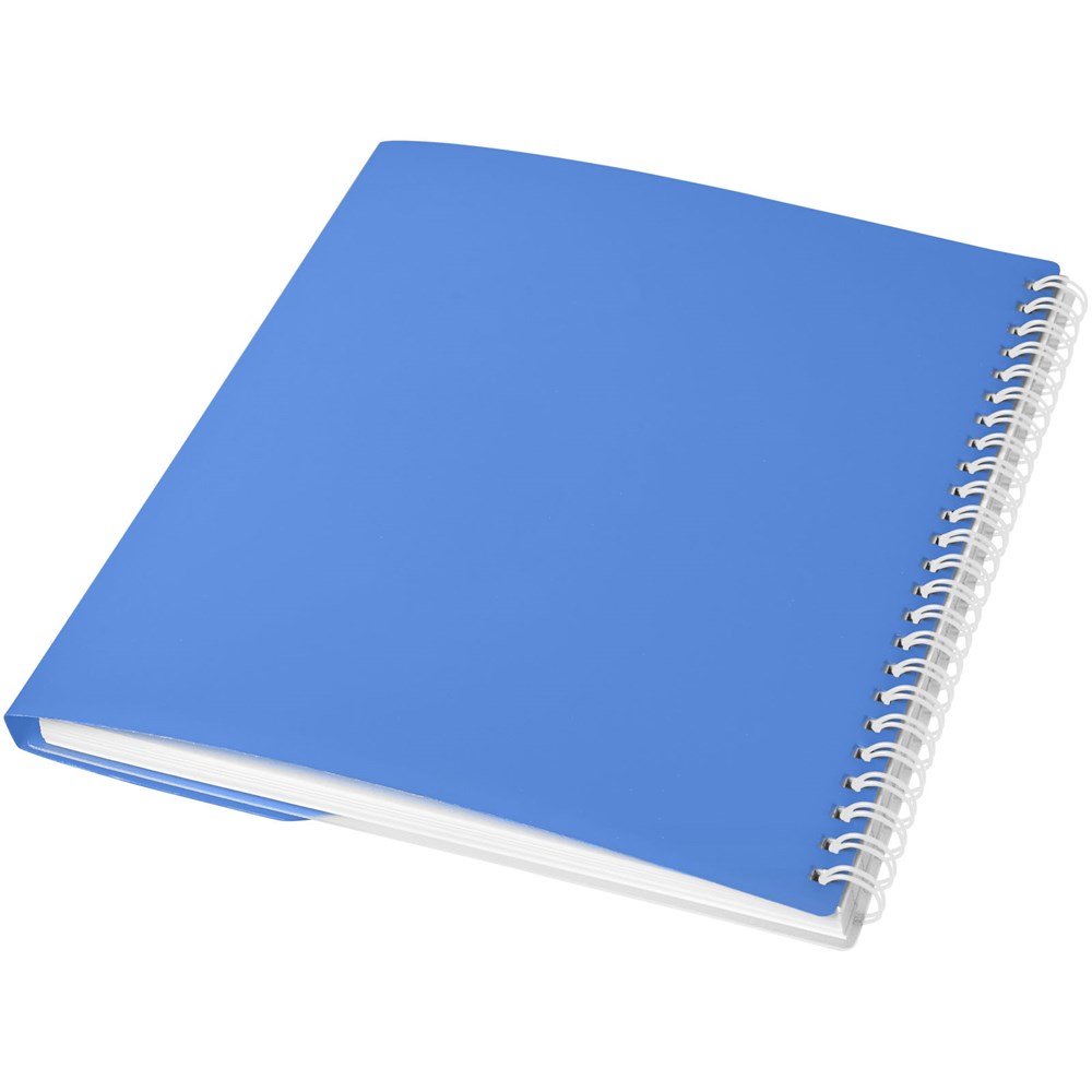 Curve A5 Spiralnotizbuch. Enthält 50 Blatt Blankopapier (80 g/m2) und einen farbigen Polypropylenumschlag von 500 Mikron. Die geschwungene Form verschließt das Notizbuch sicher. Eine Dekoration ist auf dem Umschlag sowie auf jedem Blatt möglich.