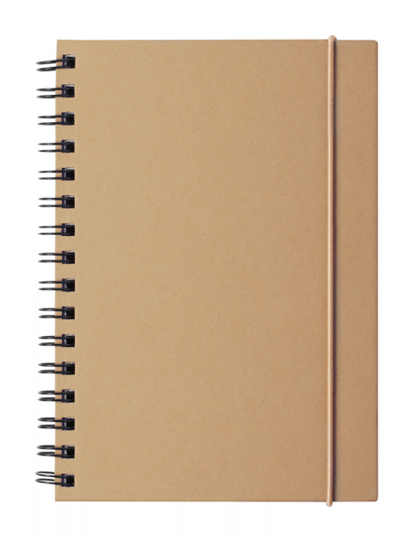 Spiral-Notizbuch aus recyceltem Karton mit Gummiband. 80 linierte Seiten, Größe A5.