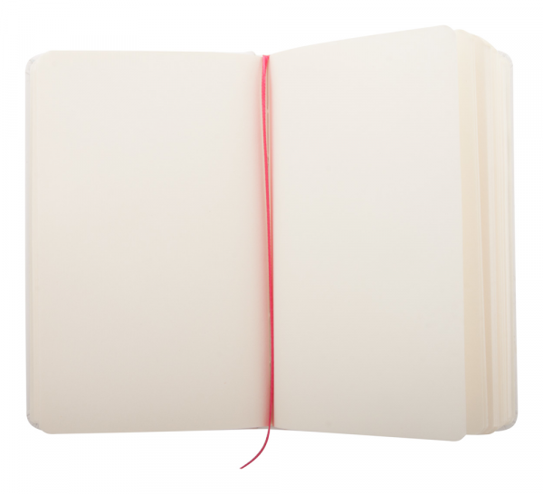 B7 Notizbuch mit weißem Karton-Einband, 80 Seiten (blanko) und farbigem Gummiband.