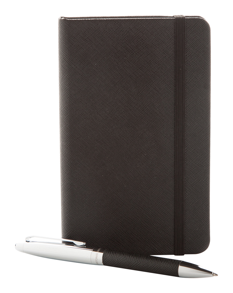 Elegantes Business-Set mit Metall-Kugelschreiber und Notizbuch mit Kunstleder-Einband(100 Seiten, blanko). Verpackt in schwarzer Geschenkbox. Antonio Miro Markenprodukt.
