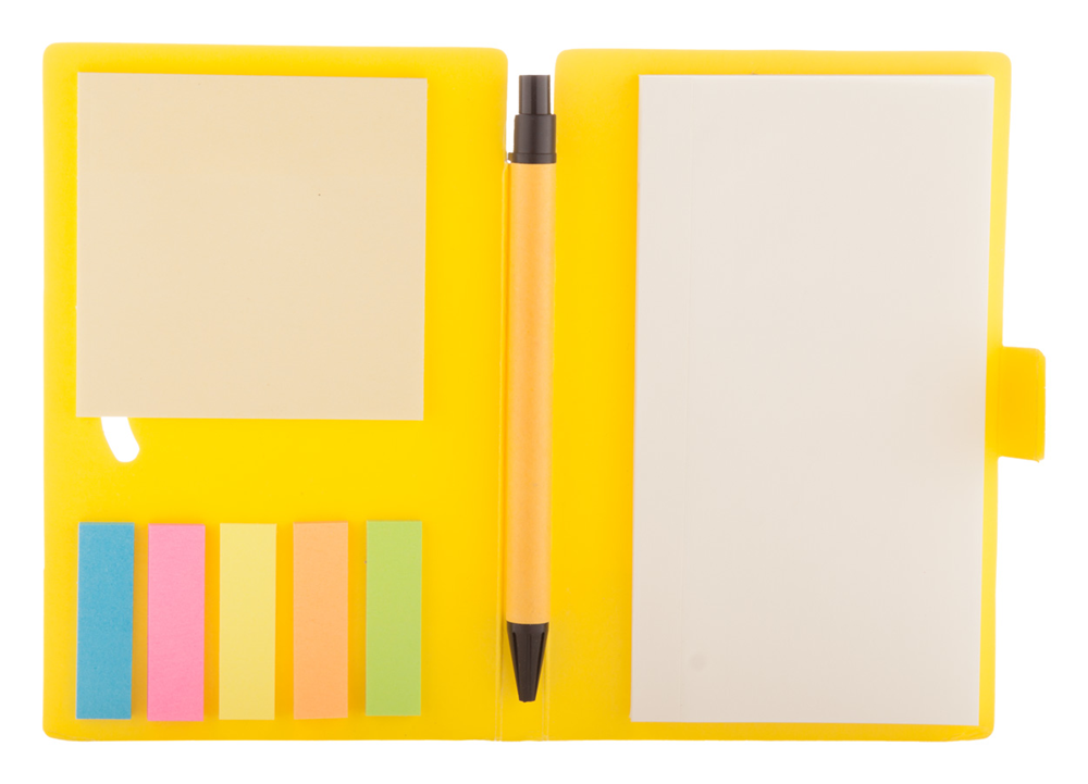 Notizbuch mit Kartonumschlag (70 Seiten, blanko) und Kugelschreiber aus Recycling Papier (blauschreibend). Inkl. Haftnotizen in 2 Größen (25 Blatt groß und 5x25 Blatt klein).