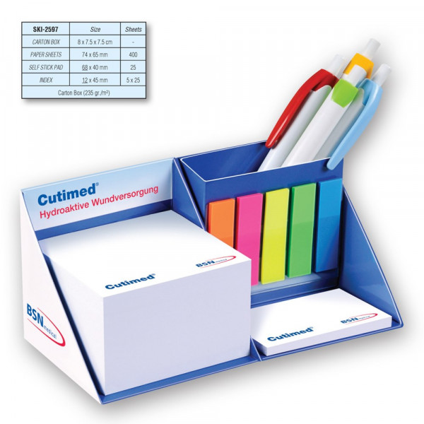 Kartoncover 7,8x7,8x7,2 cm - 4/4c, Maße geschlossen - seitlich aufklappbar, links innen , mit Notizblock - hinten geleimt, 7,5x6,5 cm - ca. 400 Blatt - 2/0c, rechts innen mit , Haftnotizen - 6*x4 cm - 25 Blatt - 2c, Kunststoff-Index -12x45 mm/5x25 Stck, in 5 Standardfarben, Schreibgeräte-Fach 7,5x2,3x7cm oben offen