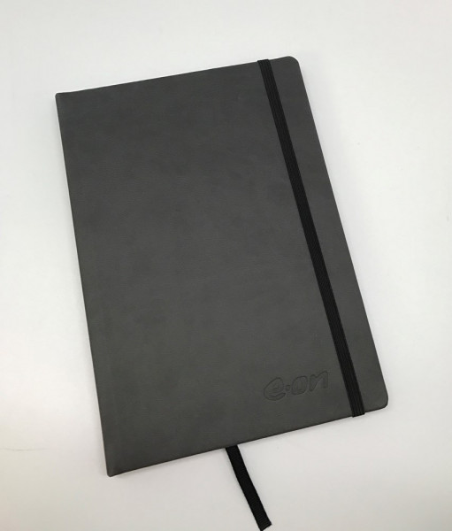 Notizbuch - 21x15 cm , Cover außen - Kunst-Leder in einer unserer Standardfarben, 96 Blatt - 80 gr - 1/1c , Buchbindung, Lesezeichen & Gummiverschluss, einzeln mit Papierbanderole verschlossen