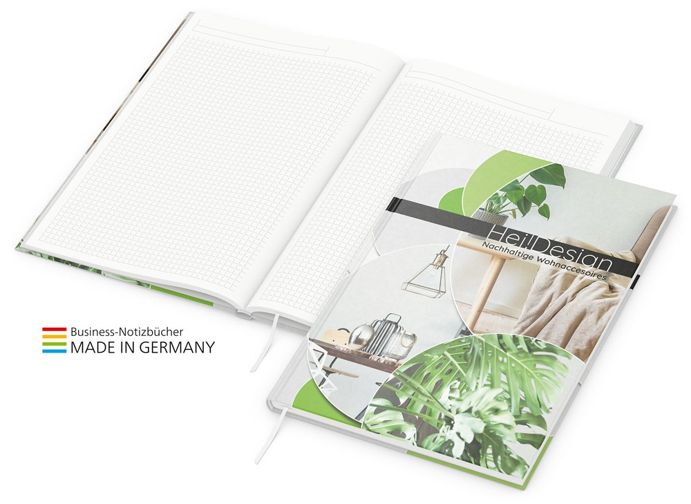 Klassisches Notizbuch mit Business-Ausstattung, mit dem man garantiert nichts falsch macht. Aus Recyclingpapier und -karton mit dem "blauen Engel". Format: A4 oder A5 Ausstattung: Hardcover mit Natura-Einband (buchbinderisch verarbeitet); individuell; unwattiert; 192 Seiten; Notizseiten mit Winkelkaro; Mikroperforation; Lesezeichen und Kapitalband; runder Rücken; spitze Ecken; Einstecktasche Werbefläche: kompletter Einband Werbung: 4C-Druck inklusive