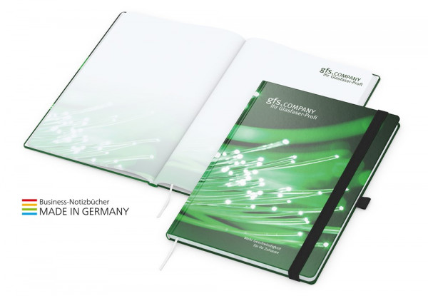 Das komplette Notizbuch kann individuell gestaltet werden: Komplett individuell bedruckter Einband und komplett individuell bedruckte Notizseiten, mit Gummiband und Stiftschlaufe in schwarz. Format: A4 oder A5 | Ausstattung: Hardcover mit Einband Cover-Star (buchbinderisch verarbeiteter Einband); gloss- oder matt-individuell; unwattiert; 192 Seiten; Notizseiten mit 4C-Einzelblattdruck; Buchblock und Decke mit runden Ecken; Gummiband und Stiftschlaufe in gelb, grün, mittelblau, orange, rot, schwarz oder silbergrau; Lesezeichen und Kapitalband; runder Rücken; Einstecktasche | Werbefläche: kompletter Einband und Inhalt | Werbung: 4C-Druck inklusive