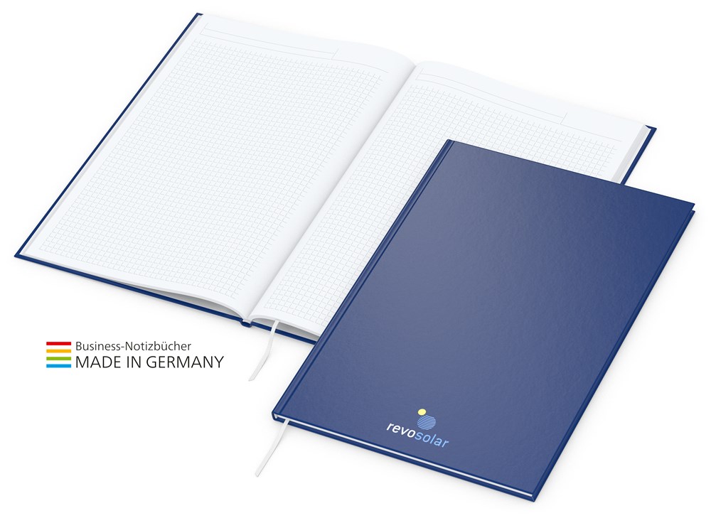 Das Memo-Book in 5 Farben mit Veredelung im Siebdruck-Digital überzeugt mit seiner Reduktion auf das Wesentliche: Ihr Logo, günstiger Preis, große Werbewirkung dank täglichem Gebrauch. Format: A4 oder A5 | Ausstattung: Hardcover mit Cover-Star Einband (buchbinderisch verarbeiteter Einband); matt-dunkelblau, matt-rot, matt-schwarz, matt-silber oder matt-weiß; unwattiert; 128 Seiten; Notizseiten mit Winkelkaro; Mikroperforation; Lesezeichen und Kapitalband; gerader Rücken; spitze Ecken | Werbefläche: 100 x 50 mm | Werbung: vierfarbiger Siebdruck-Digital inklusive