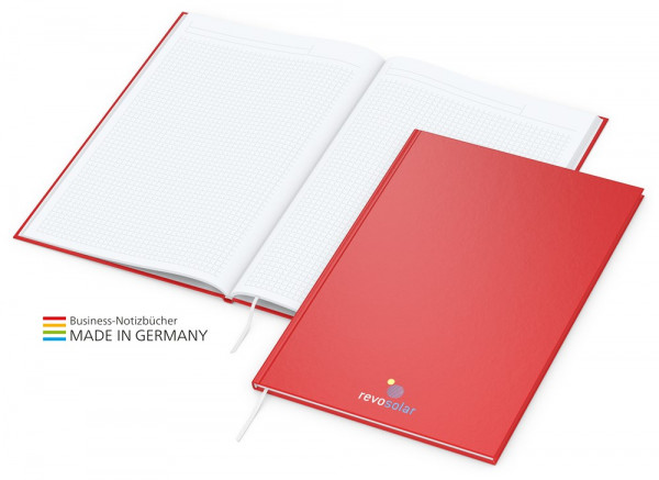 Preisgünstig, leicht und reduziert auf das Wesentliche: Memo-Book mit 128 Seiten und spitzen Ecken. Format: A4 oder A5 | Ausstattung: Hardcover mit Cover-Star-Einband (buchbinderisch verarbeiteter Einband); matt-dunkelblau, matt-rot, matt-schwarz, matt-silber oder matt-weiß; unwattiert; 128 Seiten mit Winkelkaro und Mikroperforation; Lesezeichen, Kapitalband; gerader Rücken Werbefläche: 100 x 50 mm | Werbung: vierfarbiger Siebdruck-Digital inklusive
