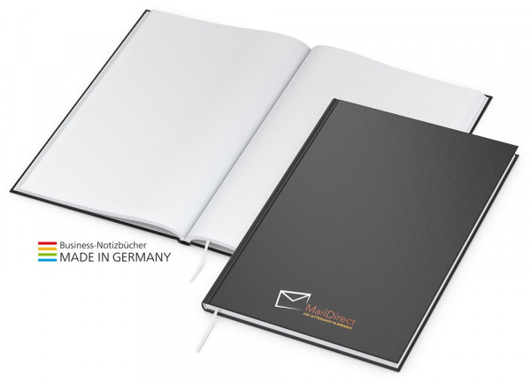Klassisches Notizbuch mit Business-Ausstattung, mit dem man garantiert nichts falsch macht. Einband in 5 attraktiven Farben, veredelt mit Ihrem Logo im Siebdruck-Digital. Format: A4, A5 oder Pocket Ausstattung: Hardcover mit Cover-Star Einband (buchbinderisch verarbeiteter Einband); matt-dunkelblau, matt-rot, matt-schwarz, matt-silber oder matt-weiß; unwattiert; 192 Seiten; Notizseiten mit Winkelkaro; Mikroperforation; Lesezeichen und Kapitalband; runder Rücken; spitze Ecken; Einstecktasche Werbefläche: 100 x 50 mm (Pocket 75 x 50 mm) | Werbung: vierfarbiger Siebdruck-Digital inklusive