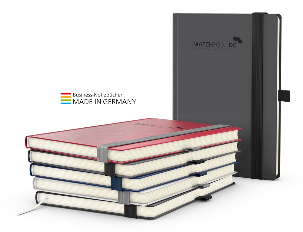 Modern und mit Vollausstattung: Vision-Book in mattem, glattem Kunstledereinband und farblich abgestimmter Vollausstattung mit Gummiband und Stiftschlaufe. Format: A4 oder A5 | Ausstattung: Hardcover mit Einband in Future (mattes Kunstleder) anthrazit, dunkelblau, rot, schwarz oder weiß; unwattiert; Buchblock und Decke mit runden Ecken; 192 Seiten mit Winkelkaro und Mikroperforation; Cremefarbendes Schreibpapier; Gummiband und Stiftschlaufe; Einstecktasche; Lesezeichen, Kapitalband; runder Rücken Werbefläche: 100 x 50 mm | Werbung: Prägung inklusive | Farbvarianten: Einband anthrazit mit Gummiband schwarz; Einband dunkelblau mit Gummiband dunkelblau; Einband rot mit Gummiband silbergrau; Einband schwarz mit Gummiband schwarz; Einband weiß mit Gummiband silbergrau