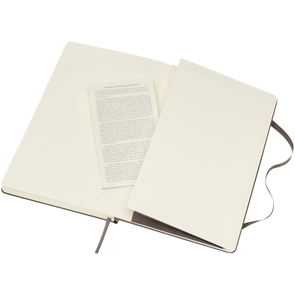 Das Moleskine Classic Hardcover Notizbuch in Größe L (13x21 cm) hat einen kartongebundenen Einband mit abgerundeten Ecken, säurefreies Papier, ein Lesezeichenband und einen elastischen Verschluss. Auf der ersten Seite finden Sie Platz für einen Hinweis „bei Verlust“ und zur Belohnung für den Finder. Auf der Rückseite befindet sich eine erweiterbare Innentasche, auf der die Geschichte von Moleskine steht. Die Tasche kann für lose Zettel und Notizen verwendet werden. Enthält 240 elfenbeinfarbene blanko Seiten. Die Seiten sind auch mit gepunktetem, kariertem und liniertem Papier erhältlich. Erhältlich in einer großen Auswahl an stilvollen, lebendigen Farben.