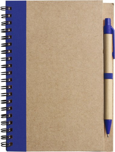 Notizbuch aus recyceltem Papier mit Ringbindung und farbigen Applikationen mit 60 linierten Seiten inkl. Kugelschreiber aus Karton/Kunststoff mit blauer Mine.