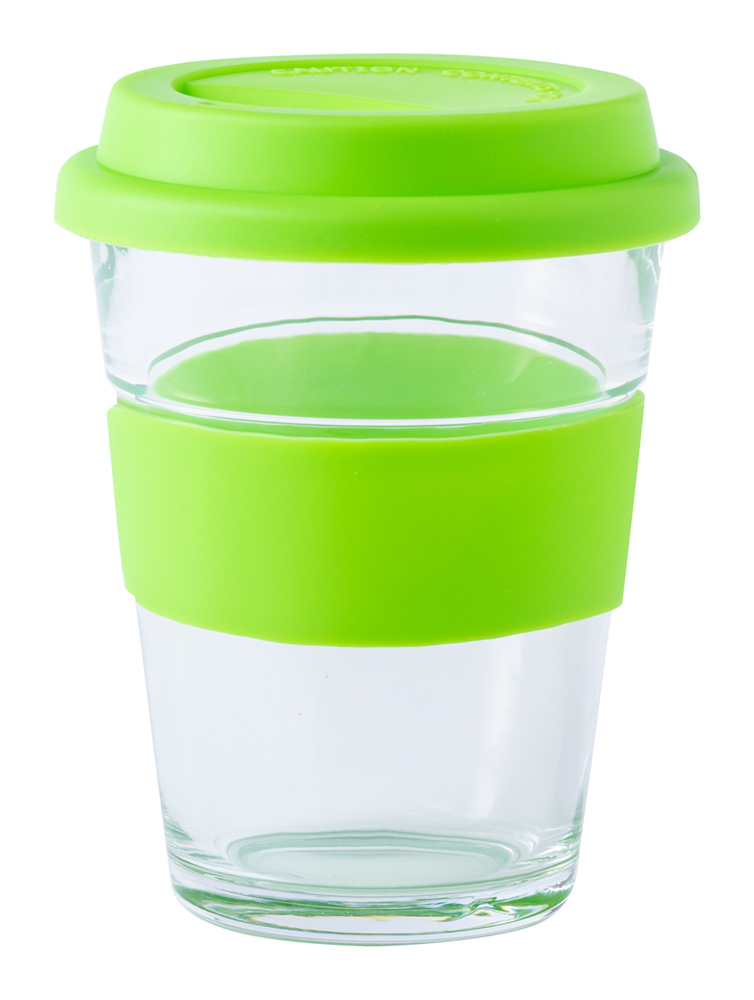 Einwandiger Reisebecher aus Glas mit Silikondeckel und -ring. Füllmenge: 350 ml.