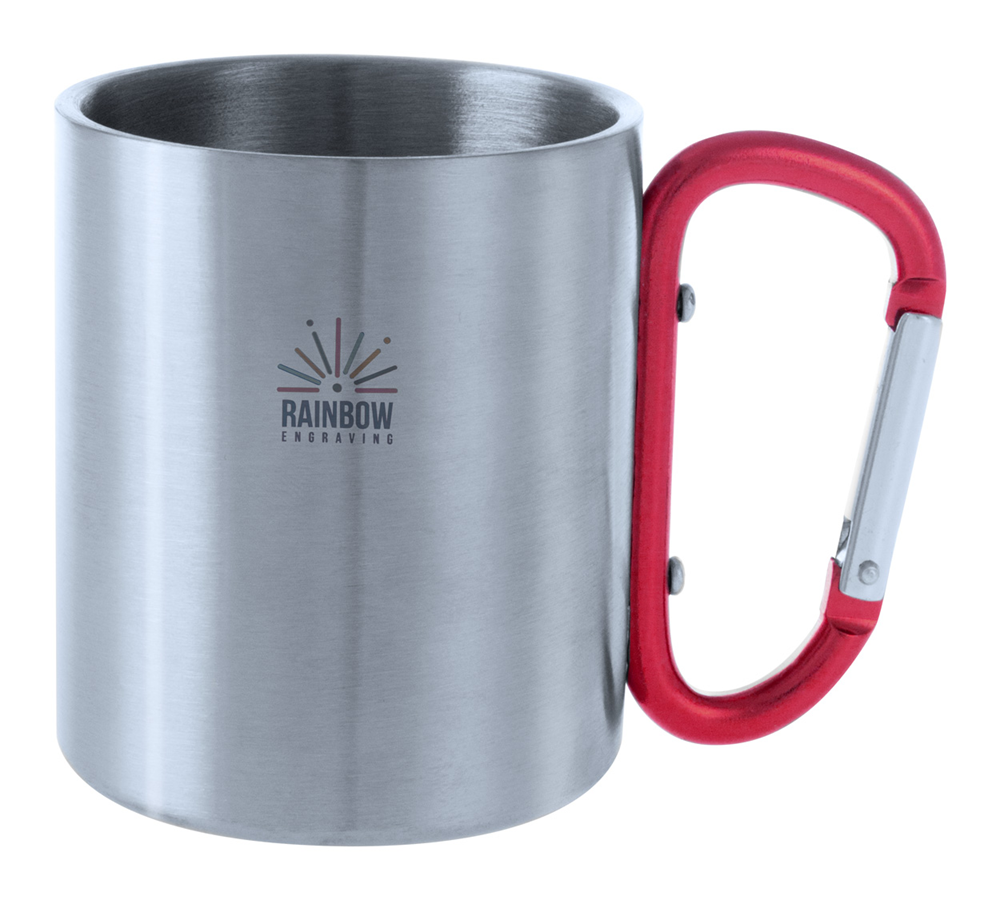 Edelstahltasse mit farbigem Karabiner-Henkel. Füllmenge: 200 ml. Einzeln in Geschenkbox.