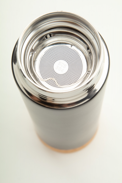 Doppelwandige Isolierkanne aus Edelstahl mit Tee-Ei und Korkfuß. Füllmenge: 450 ml.