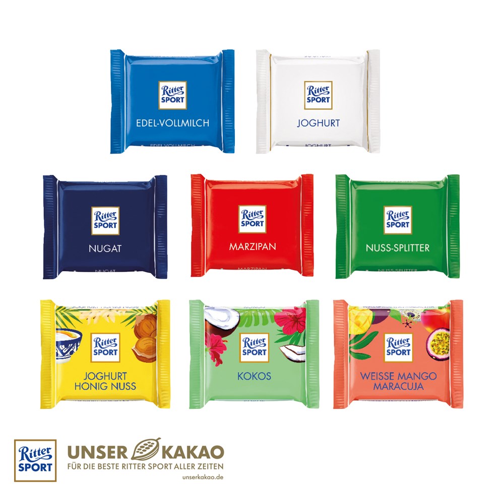 Die beliebten Leckerbissen! Alle auf die Kleinen! Nuss-Splitter, Marzipan, Nugat, Edel-Vollmilch, Joghurt oder unsere Sommersorten sorgen immer für einen großen Auftritt. Nachhaltigkeit: Klimaneutrales Produkt. FSC®-zertifizierter Karton aus nachhaltiger Forstwirtschaft. Seit 2018 bezieht Ritter SPORT 100 % zertifizierten nachhaltigen Kakao für das gesamte Sortiment (www.unserkakao.de)