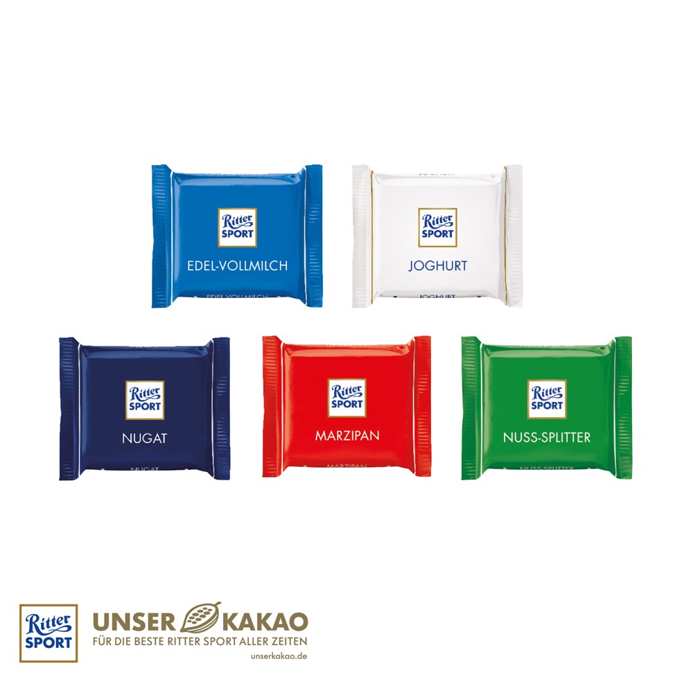 Süße Grüße mit optimaler Werbefläche! Kleine Aufmerksamkeit mit großer Wirkung: Kombinieren Sie Ihr Wunschprodukt mit der individuell bedruckbaren Werbe-Klappkarte. Nachhaltigkeit: Klimaneutrales Produkt. FSC®-zertifizierter Karton aus nachhaltiger Forstwirtschaft. Seit 2018 bezieht Ritter SPORT 100 % zertifizierten nachhaltigen Kakao für das gesamte Sortiment (www.unserkakao.de)