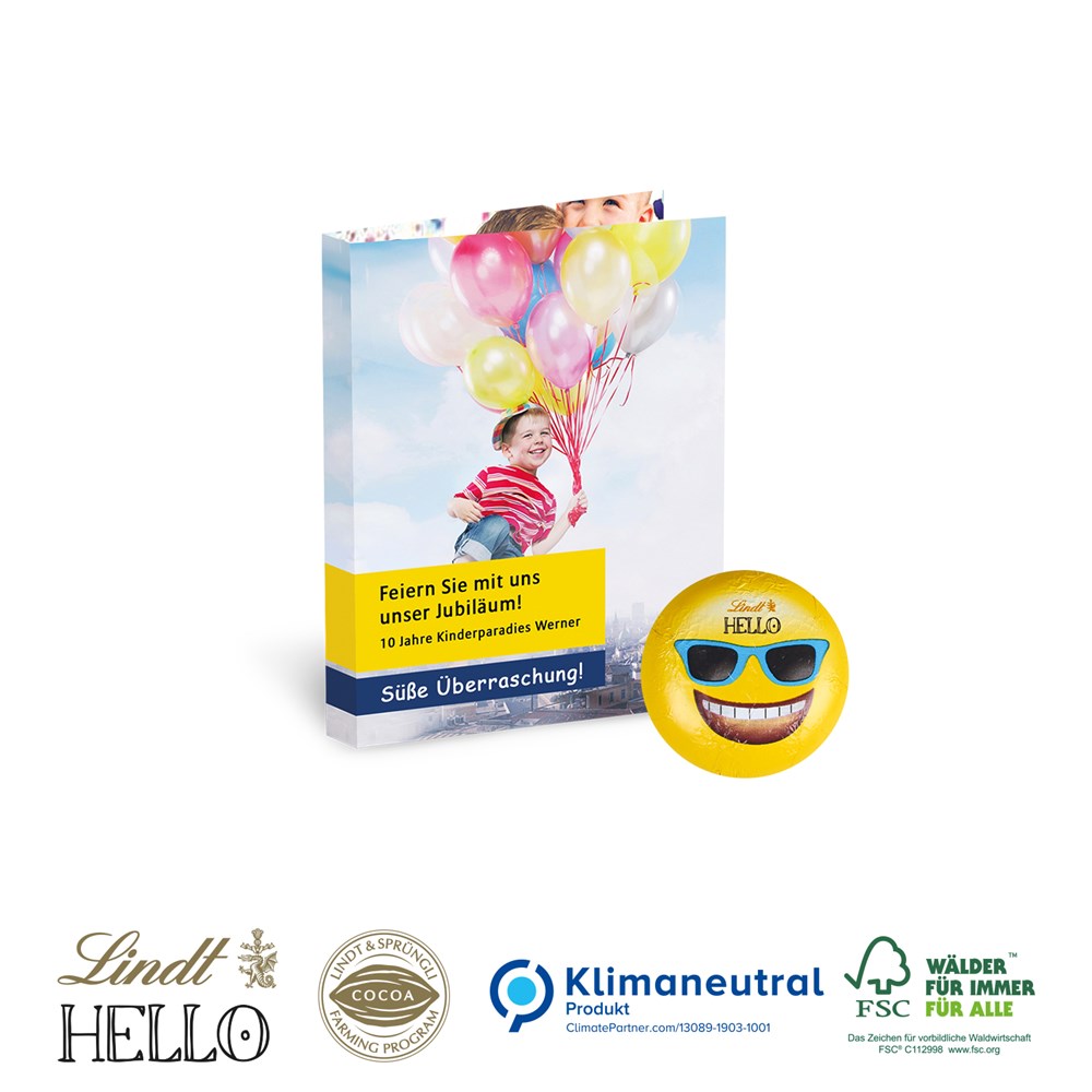 Süße Grüße mit optimaler Werbefläche! Kleine Aufmerksamkeit mit großer Wirkung: Kombinieren Sie Ihr Wunschprodukt mit der individuell bedruckbaren Werbe-Klappkarte. Nachhaltigkeit: Klimaneutrales Produkt. FSC®-zertifizierter Karton aus nachhaltiger Forstwirtschaft. Das Lindt & Sprüngli Farming-Programm steht für nachhaltige Kakaobohnen-Beschaffung (www.farming-program.com)