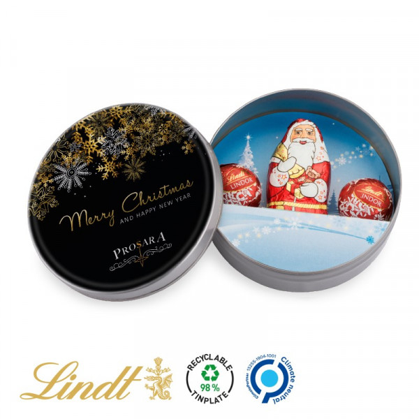 Lindt Schokoladen Weihnachtsmann und Lindor Mini Kugeln in runder Dose mit Stülpdeckel, weiß oder matt-silber aus Metall, klimaneutral, individuell bedruckt. Mit weihnachtlich gestaltetem Display Einleger. Weißblech 98 % recycelbar. Inhalt: Ein Lindt Schokoladen Weihnachtsmann aus feiner Alpenvollmilchschokolade, 10 g und zwei Lindor Mini Kugeln à 4,5 g der Marke Lindt & Sprüngli. Saisonartikel - solange der Vorrat reicht! Haltbarkeit: Bis mindestens 01.04.2022. Preise: Euro / Stück inkl. 4-c Euroskala Druck zzgl. Drucknebenkosten. Kühl und trocken lagern.
