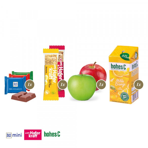 Leckere Pause To go! Der neue Snack-Pack Fitness wird individuell mit Ihrem Firmenlogo und mit Ihrem Design bedruckt. Beim hochwertigen Inhalt greift jeder gerne zu. Ein leckerer Apfel der Saison, ein Corny Riegel, hohes C und ein Ritter SPORT Mini lassen keine Wünsche offen. Nachhaltigkeit: Klimaneutrales Produkt. FSC®-zertifizierter Karton aus nachhaltiger Forstwirtschaft
