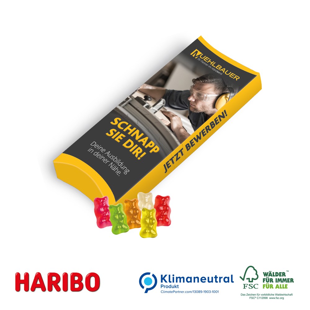 Große Werbefläche & Fruchtgummi-Freude! Der neue Fruchtgummi Promo-Pack ist ein echter Hingucker. Mit großer Werbefläche, praktischer Aufreißlasche und fruchtigem Inhalt. Ideal für Ihren Werbeeinsatz. Nachhaltigkeit: Klimaneutrales Produkt. FSC®-zertifizierter Karton aus nachhaltiger Forstwirtschaft