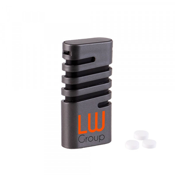 Kunststoff-Spender anthrazit gefüllt mit frischen holländischen Mini-Pfefferminzbonbons und Aufdruck auf der Vorderseite. Verschiedene Farben erhältlich.