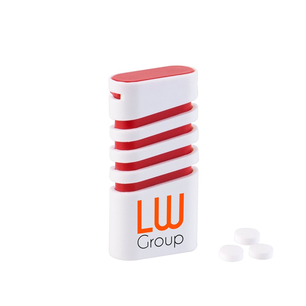 Kunststoff-Spender rot gefüllt mit frischen holländischen Mini-Pfefferminzbonbons und Aufdruck auf der Vorderseite. Verschiedene Farben erhältlich.