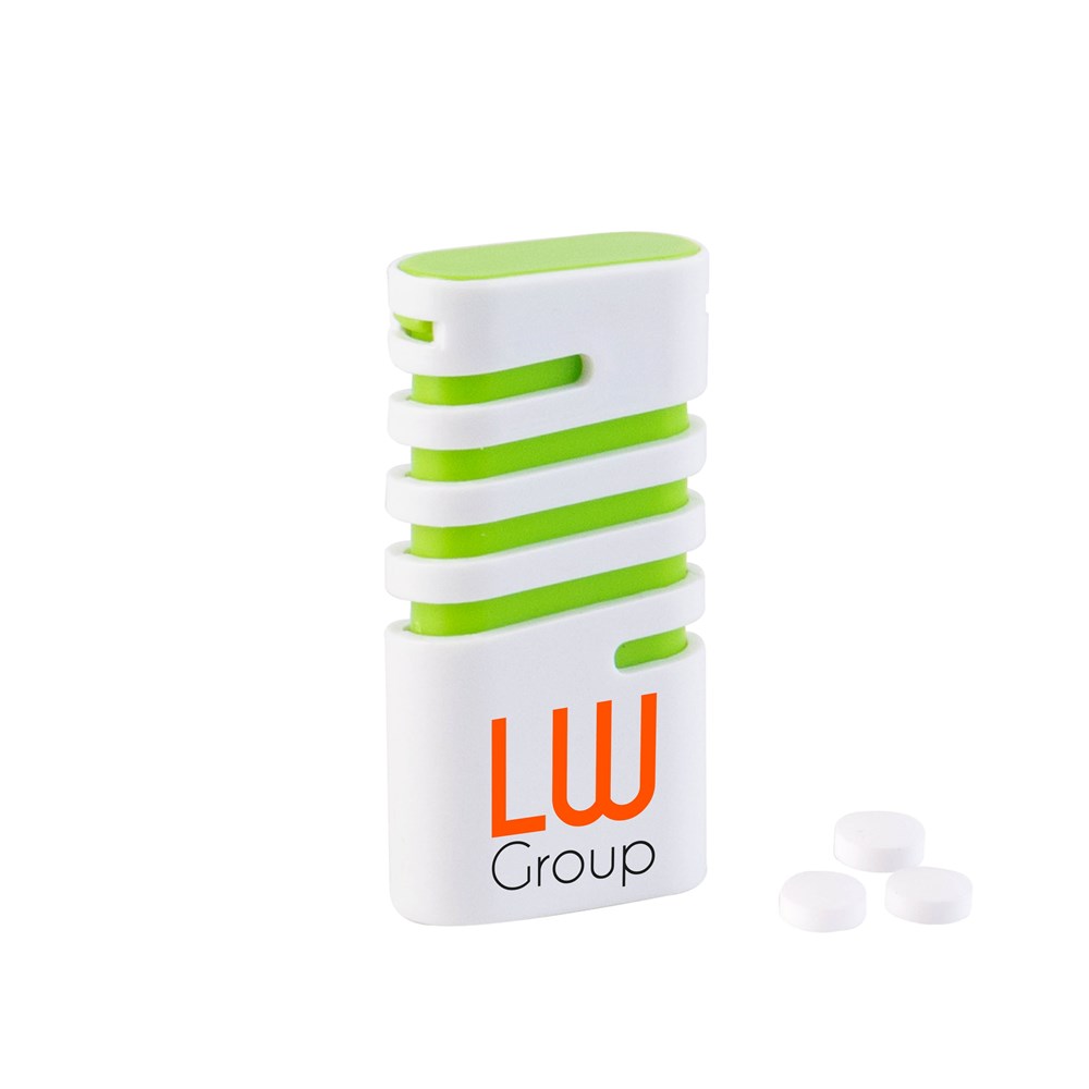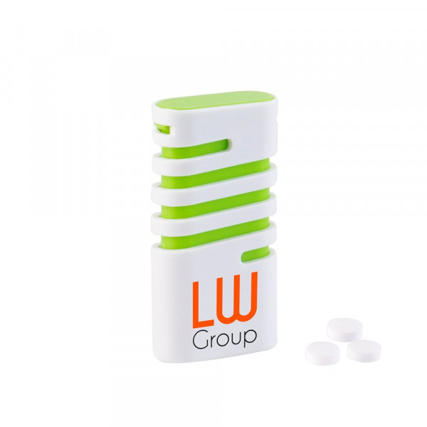 Kunststoff-Spender grün gefüllt mit frischen holländischen Mini-Pfefferminzbonbons und Aufdruck auf der Vorderseite. Verschiedene Farben erhältlich.