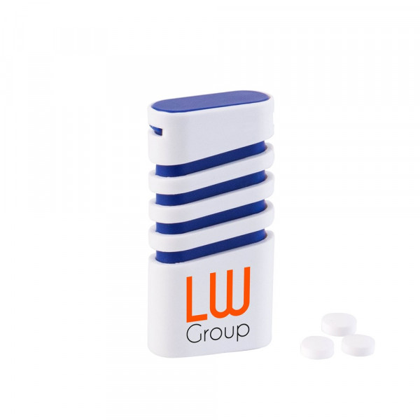 Kunststoff-Spender blau gefüllt mit frischen holländischen Mini-Pfefferminzbonbons und Aufdruck auf der Vorderseite. Verschiedene Farben erhältlich.