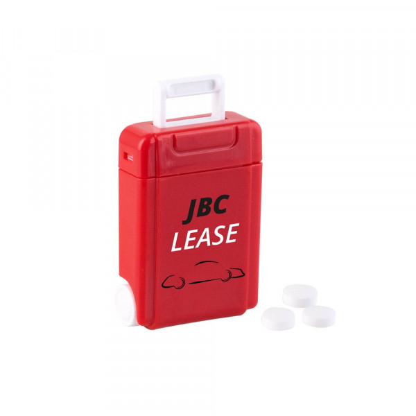 Kunststoff-Trolley-Spender rot gefüllt mit frischen holländischen Minimünzen und Aufdruck auf der Vorderseite. Verschiedene Farben erhältlich.