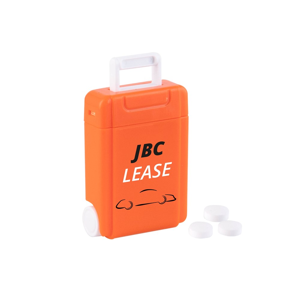 Kunststoff-Trolley-Spender orange gefüllt mit frischen holländischen Minimünzen und Aufdruck auf der Vorderseite. Verschiedene Farben erhältlich.