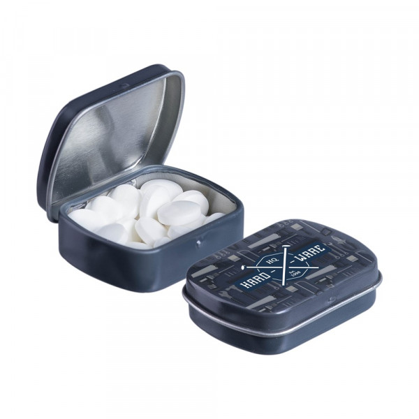 Unsere bekannte dunkel grau Mikroscharnierdose ist mit frischer holländischer Pfefferminze gefüllt, einzeln versiegelt und mit einem ZutatenAufkleber versehen. In verschiedenen Farben erhältlich